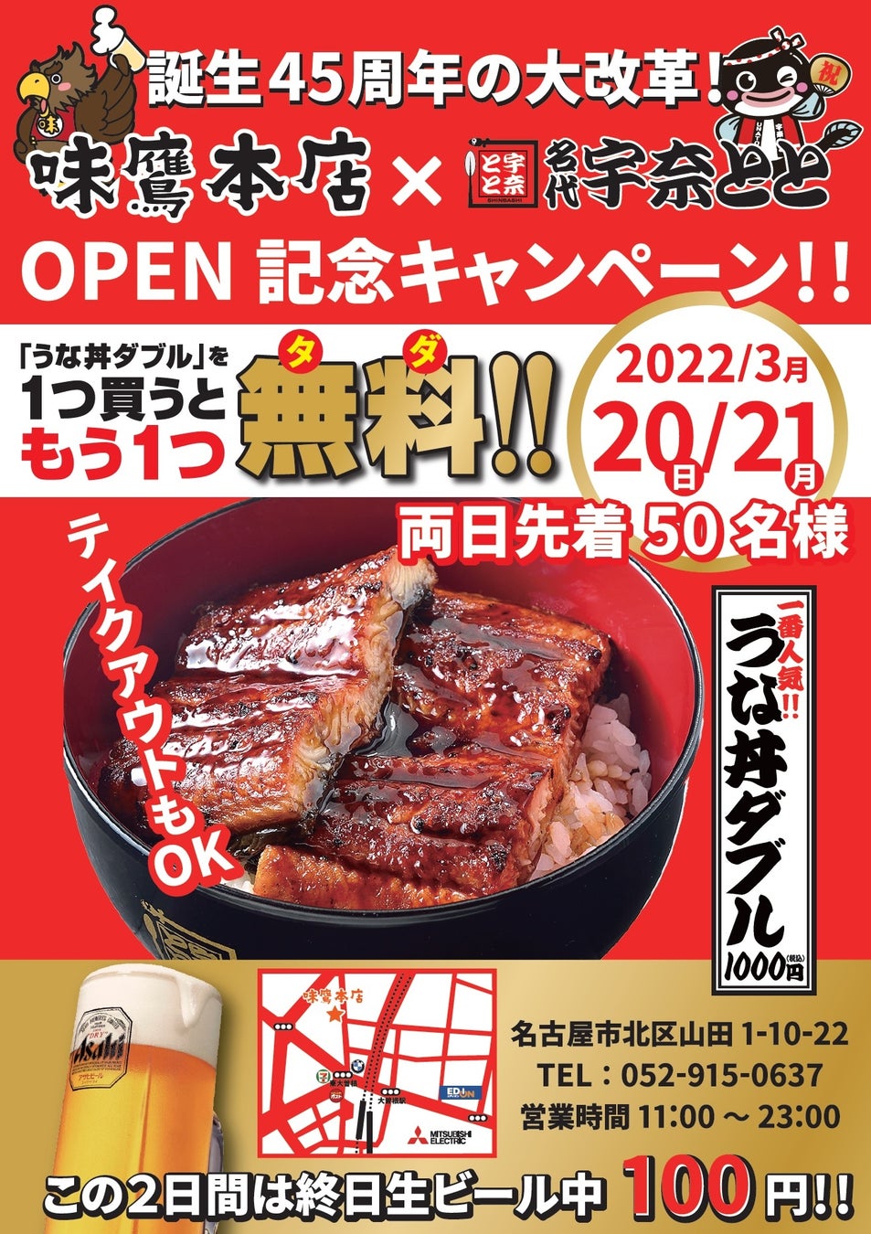 コラボ店が続々登場!【味鷹×名代 宇奈とと】「名代 宇奈とと 大曽根店」が3月20日にOPENします。お得なOPEN記念キャンペーンも実施!