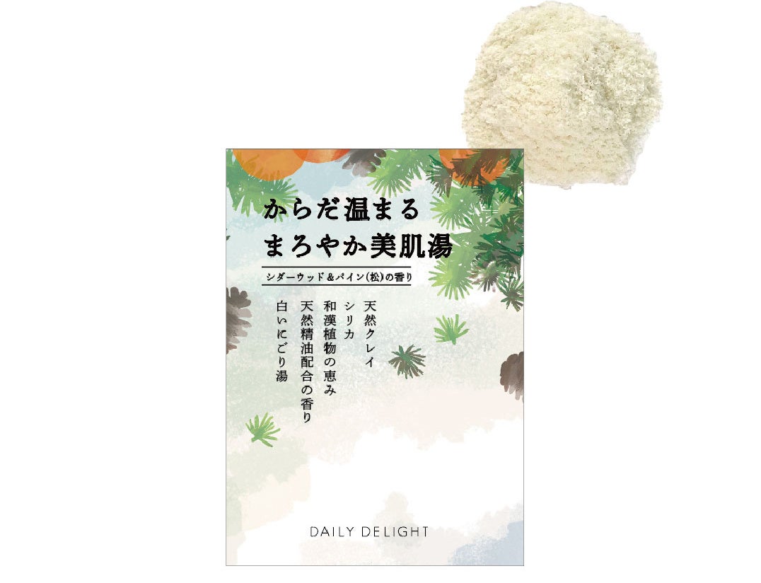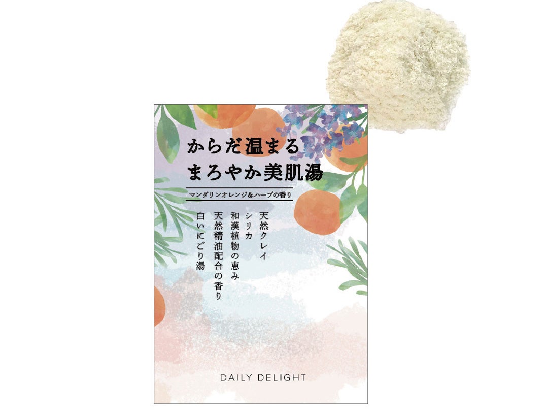 「デイリーディライト まろやか美肌バスパウダー」は、天然クレイ(ベントナイト:吸着、整肌成分)、シリカ(吸着成分)、和漢植物(保湿成分)を配合したやわらかなアルカリ性の美肌湯入浴料。立ちのぼる湯けむりにはハーブのアロマが漂います。