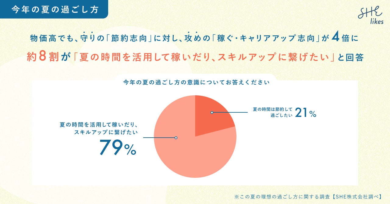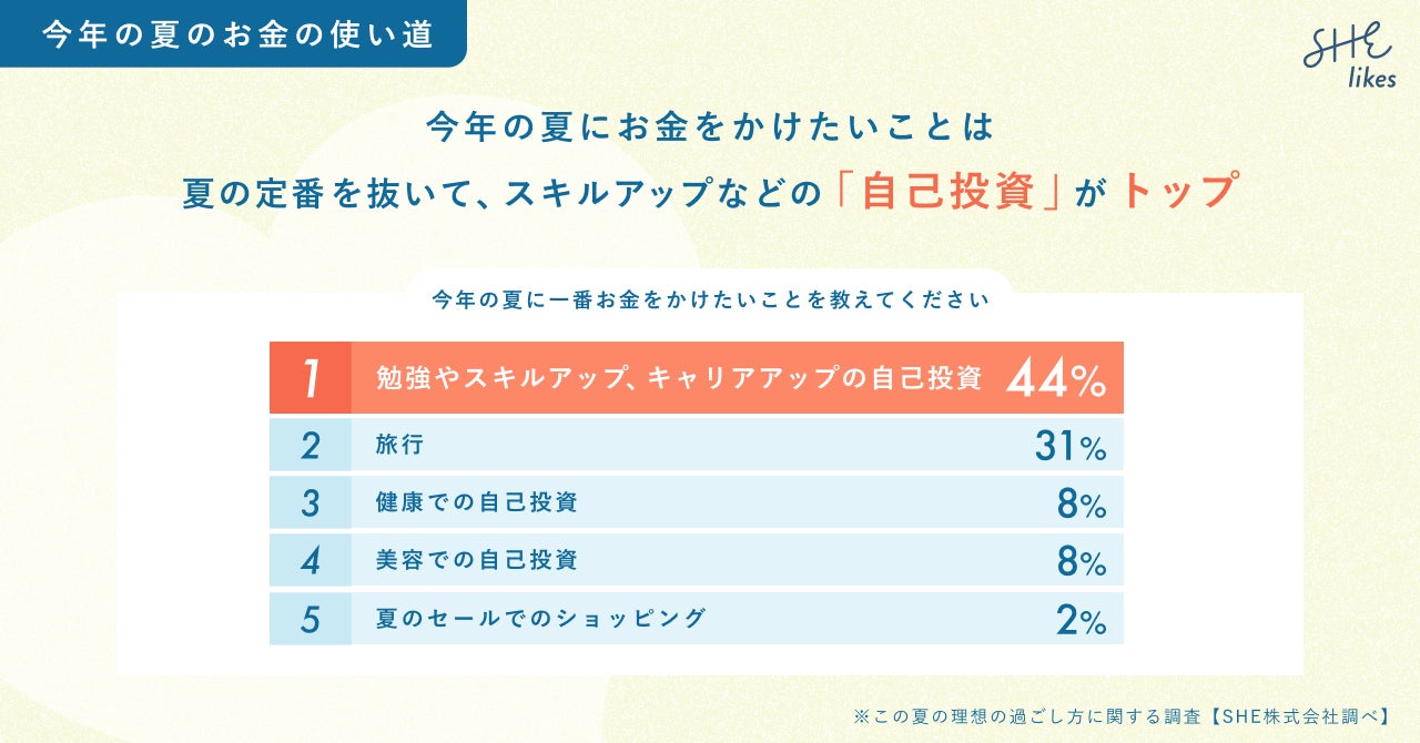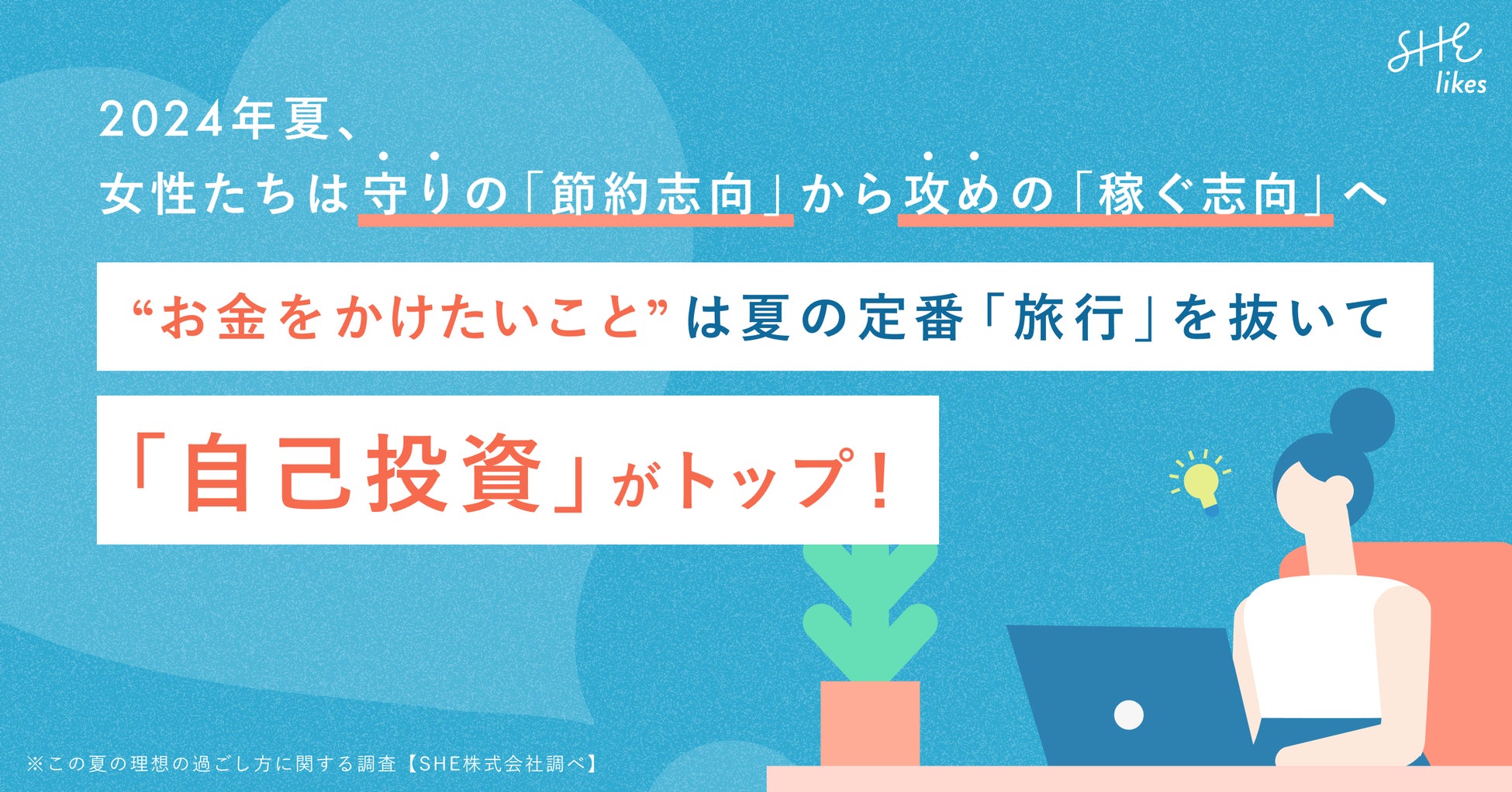 【SHE、女性の「夏の理想の過ごし方」意識調査を実施】2024年の夏は守りの「節約志向」より攻めの「稼ぐ志向」へ!一番お金をかけたいことは夏の定番“旅行”を抜いてスキルアップなどの“自己投資”がトップ