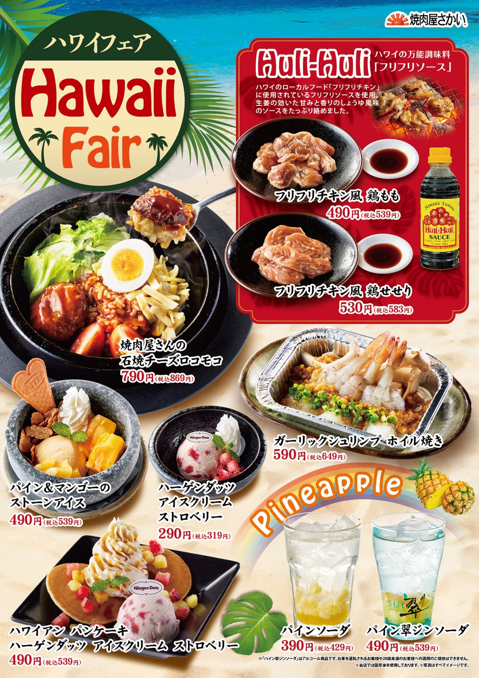 国内に56店舗を展開する「焼肉屋さかい」では2月5日(水)より期間限定で「ハワイフェア」を開催します。常夏の風土が生んだユニークなメニューを9種類ご用意させていただきました。また、ハーゲンダッツ ジャパン株式会社様とのタイアップメニューもございます。是非、この機会にお楽しみください。皆様のご来店をスタッフ一同お待ちしております。
