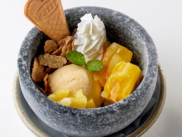 よく冷やした石鍋にバニラアイスやパインとマンゴー味のケーキトッピングを混ぜ合わせていただくデザートです。