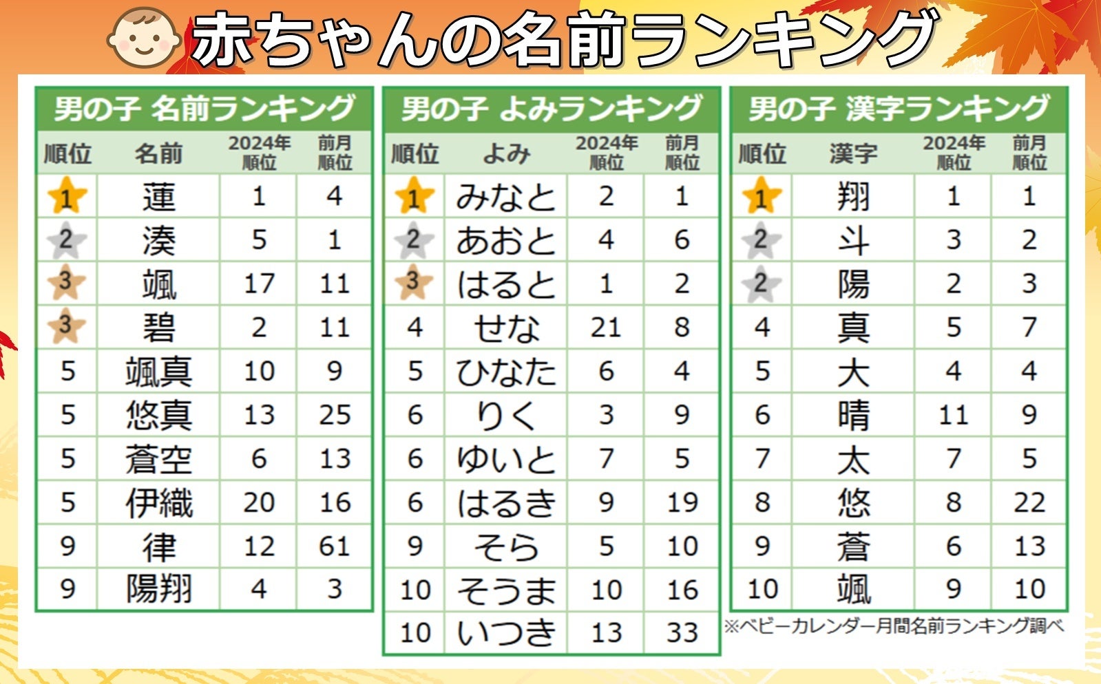 また、秋の紅葉を思わせる「楓」を使った名前「楓ネーム」もランクアップ。「楓(主なよみ:かえで)」が8月の49位から9月は18位へと急上昇し、「楓真(主なよみ:ふうま)」も8月の93位から9月は26位へ大きく順位を伸ばしています。このほかにも「楓翔(主なよみ:ふうと)」・「楓斗(主なよみ:ふうと)」・「楓太(主なよみ:ふうた)」・「楓生(主なよみ:ふうき)」など47名、22種類の名前で名付けられており、自然の美しさを映す定番漢字として定着しつつあります。