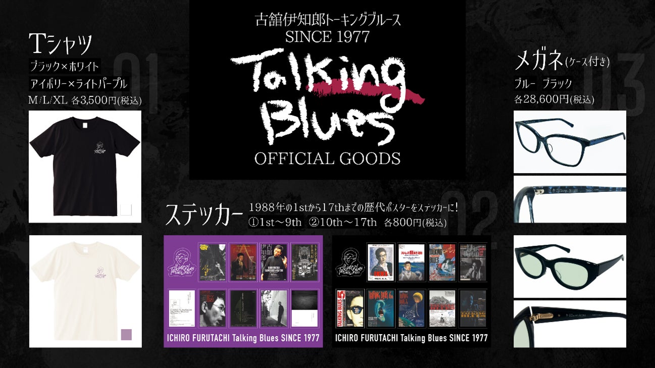 開催まであと2週間!公演を見に来たお客さんが購入できるグッズを公式HPにて公開中。ファンの人気投票で選ばれたTシャツは、胸元に古舘伊知郎の似顔絵デザイン付きで、ブラックとアイボリーの2色展開。他にも、1988年の1stから17thまでの歴代ポスターのステッカーや、特注のメガネまで!メモリアルなトーキングブルースをグッズでも盛り上げます!
