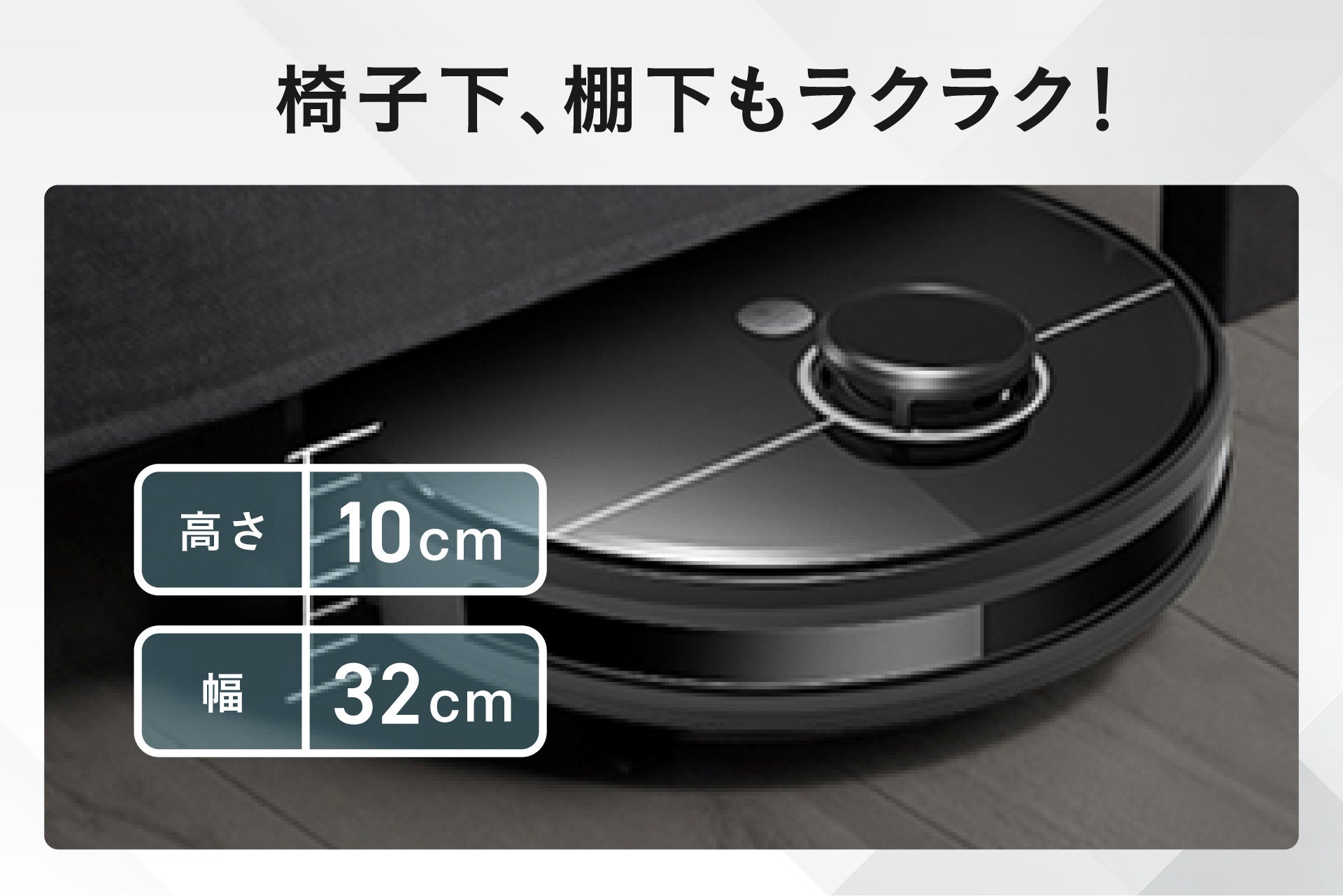 『RACLEBO slim』の名の通り、本体は幅32cm、高さ10cmのスリムサイズ。椅子やソファの下、細い廊下も引っかかることなく清掃できるため、通常サイズの業務用清掃ロボットにとっては障害物が多く清掃しにくい施設でもスムーズに稼働します。