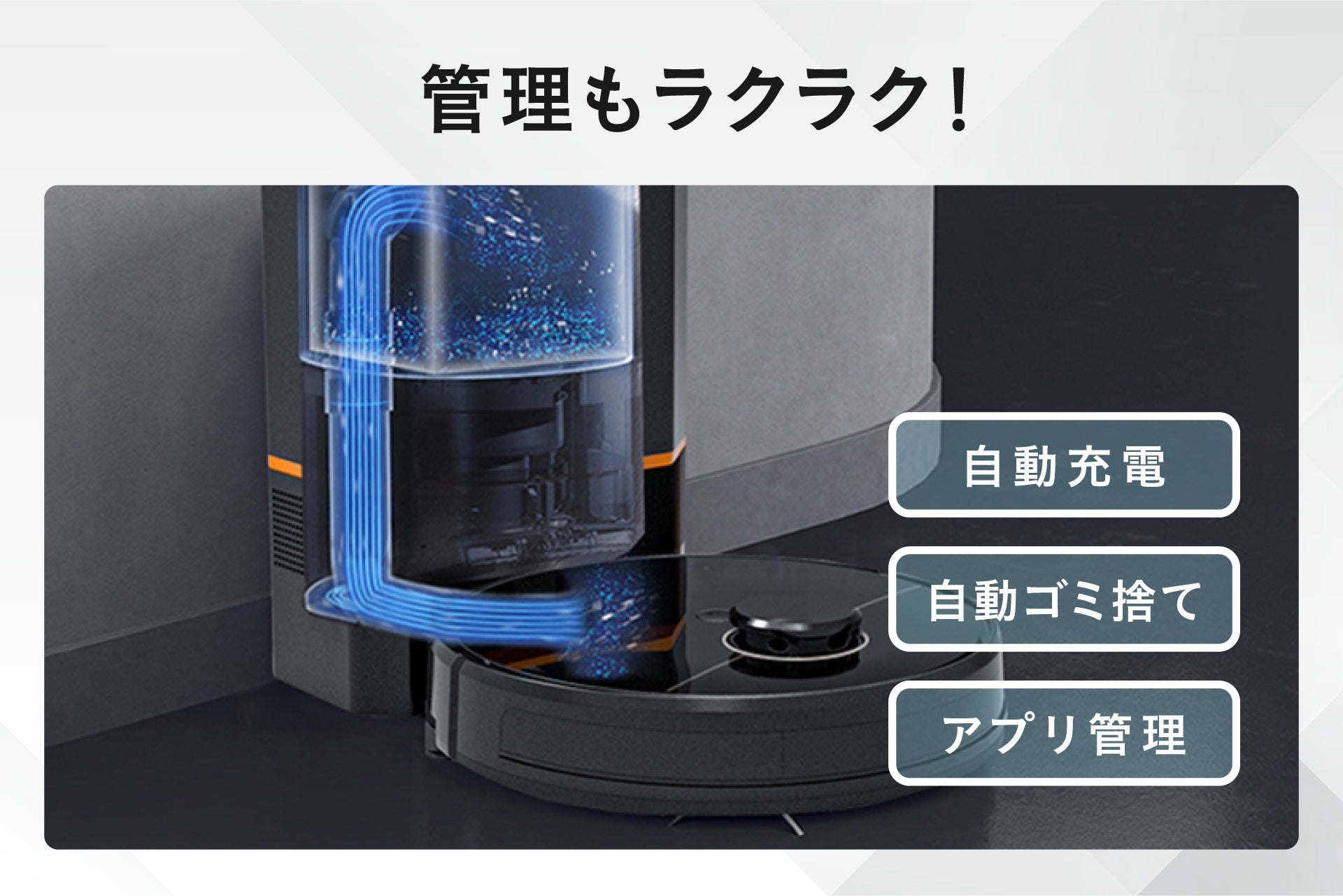 ステーションに戻ると自動で充電&ゴミ吸引を行うため、タンクがいっぱいになるまでは人がゴミを捨てる必要はありません。すぐに本体が稼働できる状態を自動でキープします。また、清掃管理は専用アプリで完結。予約設定や清掃履歴が確認できます。