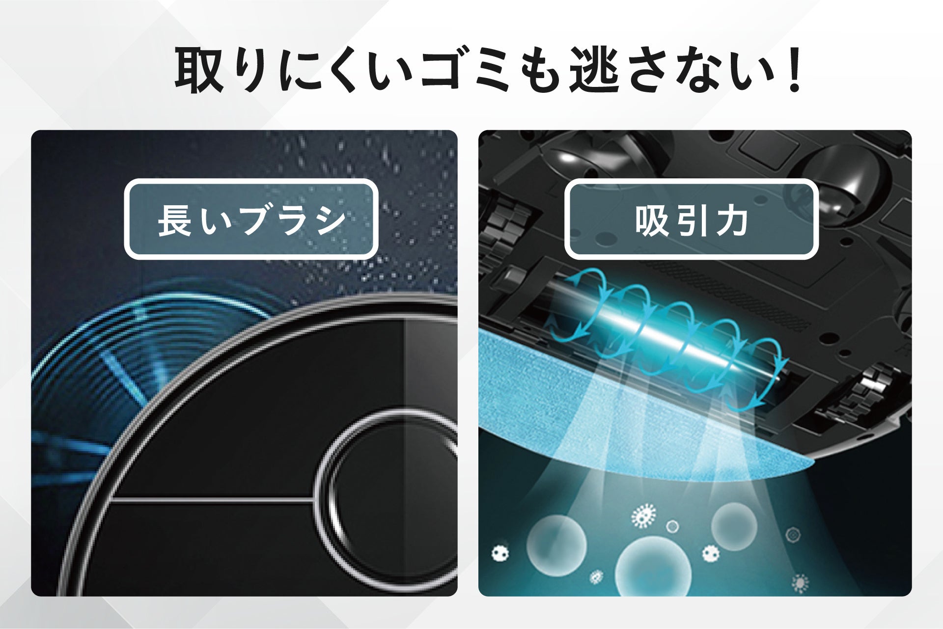 サイズはコンパクトでも安心の清掃力。清掃力を支えているのは、壁際0センチまで届く長いブラシです。ロボットは壁ギリギリまで近づき、両サイドのブラシで埃をしっかり掻き取ります。