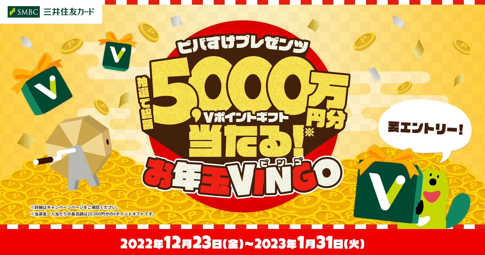 三井住友カード株式会社(本社:東京都江東区、代表取締役社長:大西 幸彦、以下:三井住友カード)は、条件達成でVポイントギフトが当たる「ビバすけプレゼンツ~総額5,000万円分!「VINGO」でお年玉をゲットせよ!」(以下、本キャンペーン)を実施いたします。