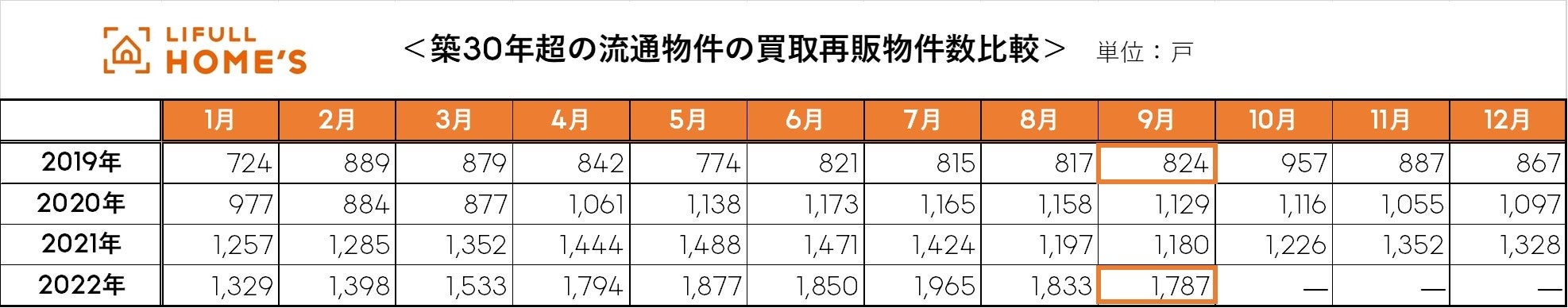 昨今の中古マンション価格の高騰の背景として、中古マンションをリノベーションやリフォームして販売する買取再販物件の増加が要因としてあることがわかりました。「LIFULL HOME'S」における買取再販物件の物件数を調べたところ、2019年9月は824戸だったのに対し、2022年9月は1,787戸と3年間で実に約2.2倍に増加しています。また、買取再販物件の市場シェア自体も2019年9月から2022年9月までで約1.5倍に拡大していました。特に2022年が顕著で、2019年から2021年までは年間で約1~2%ずつの増加だったものが、2022年は約4.6%の増加となっています。さらに、「LIFULL HOME'S」における買取再販物件の掲載社数も同期間の比較で約2.4倍となりました。新築マンションの価格高騰により中古マンションを検討する層も増えてきました。新築マンションのクオリティを求めたいものの、リノベーションやリフォームを自ら行うのはハードルが高いため、中古マンションとしてはやや割高でもすでにリノベーション済みのマンションを求める方が増えてきたことが予想されます。また、買取再販物件の掲載社数の増加は参入会社が増えていることを表しており、マーケット自体が拡大してきていると言えます。