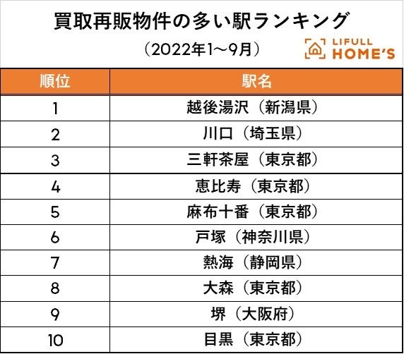 2022年1~9月における「買取再販物件の多い駅」TOP10(※)を調べたところ、1位は新潟県の「越後湯沢」、続いて埼玉県の「川口」、東京都の「三軒茶屋」となりました。