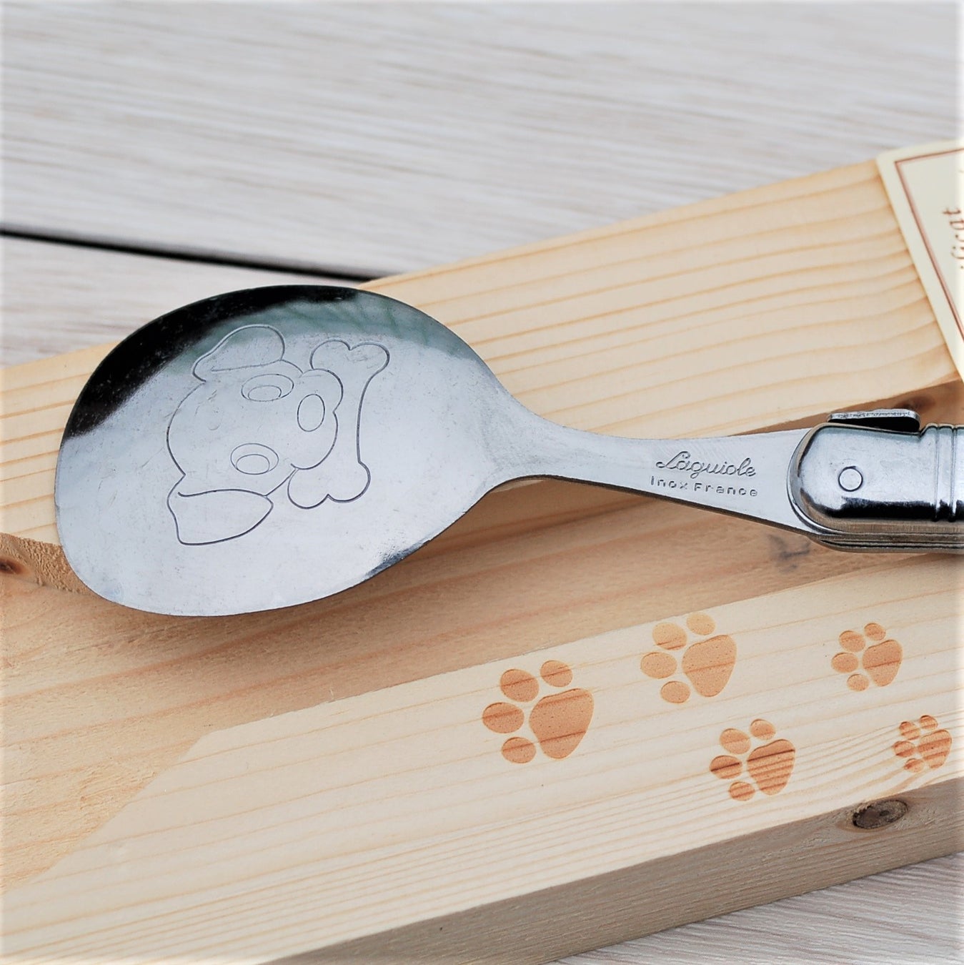 ペットをとても大事にするフランスでは、スプーンでおやつなどを与えることが多く、NERONのDOGスプーンはペット用の専用設計。ヨーロッパ・ブナの木箱にもカワイイ肉球模様がちりばめられています。箱もフランス製、国内初版売!