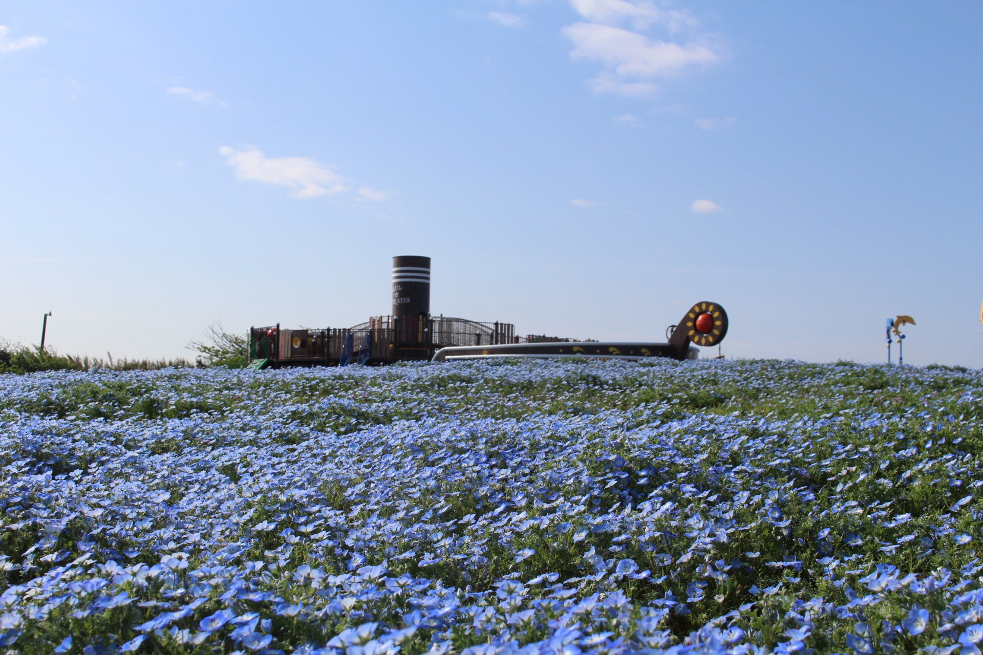 大型遊具「ソレイユ☆パイレーツ」とネモフィラの花畑(円形花畑)