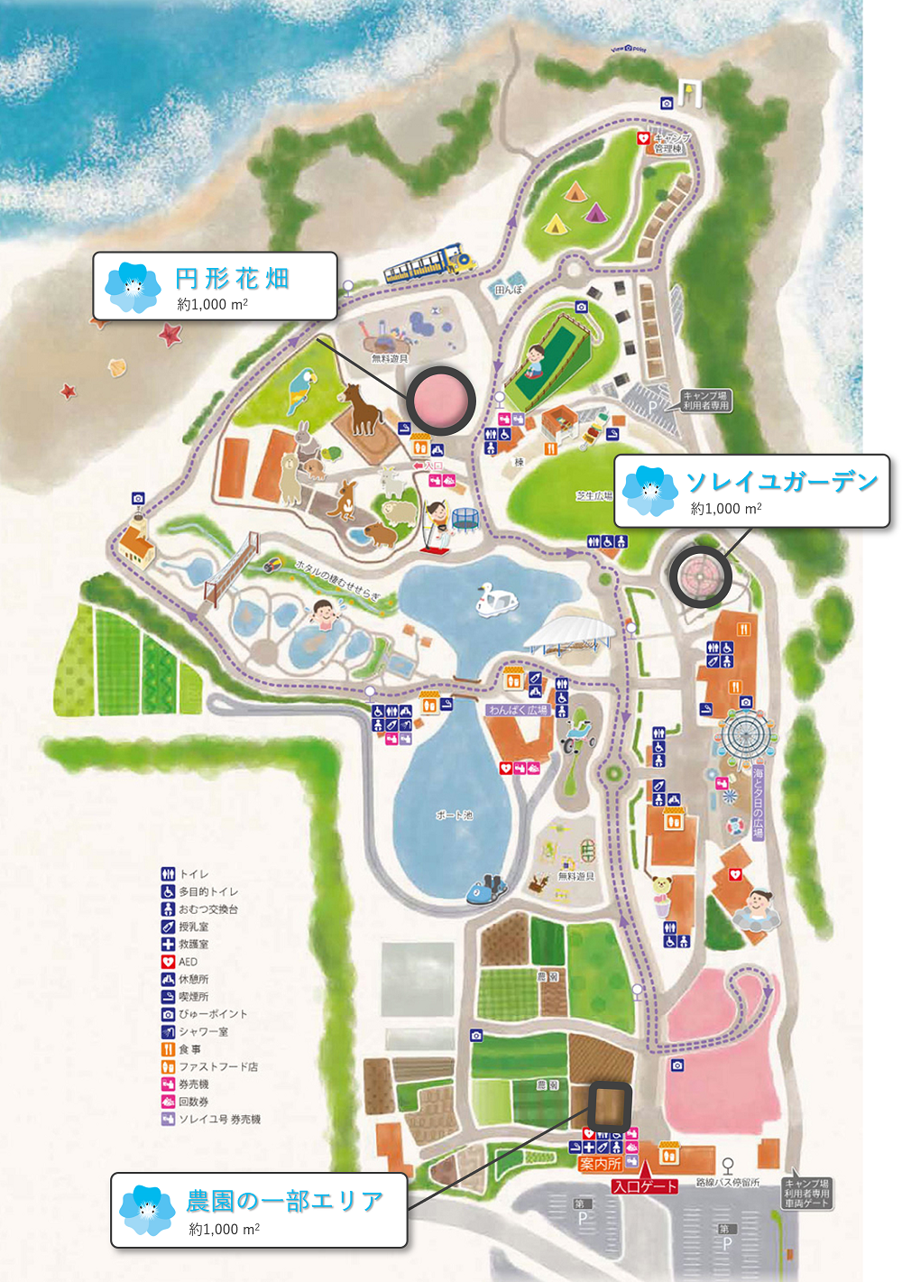 ネモフィラが見られるのは園内3つのエリアで、合計約55万本・3,000㎡の規模になります。「ソレイユガーデン」と「農園の一部のエリア」は今年から初めての植栽エリアとして増設しました!
