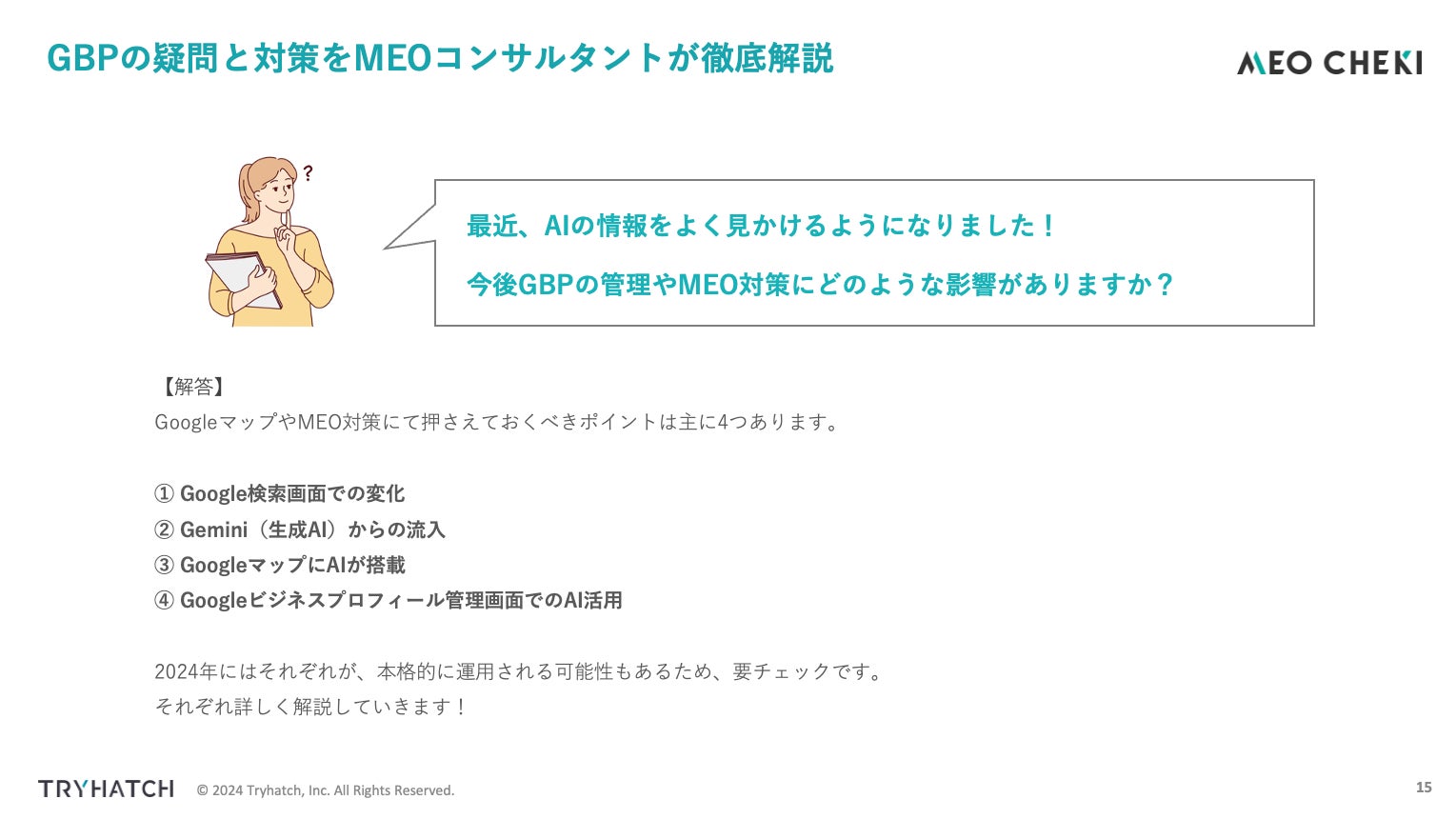 最近、AIの情報をよく見かけるようになりましたが、今後Googleビジネスプロフィールの管理やMEO対策にどのような影響がありますか?