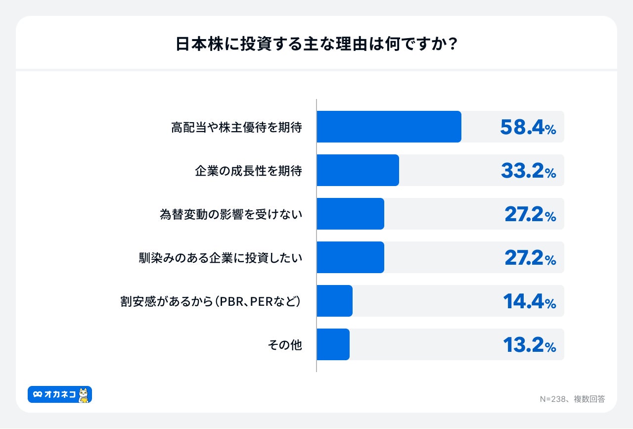 日本株に投資する理由として最も多かったのは「高配当や株主優待を期待」で、58.4%が選択しました。次いで「企業の成長性を期待」が33.2%、「為替変動の影響を受けない」と「馴染みのある企業に投資したい」がともに27.2%でした。この結果から、個人投資家は日本株に、安定的なインカムゲイン(配当や優待)を強く求めていることが分かります。