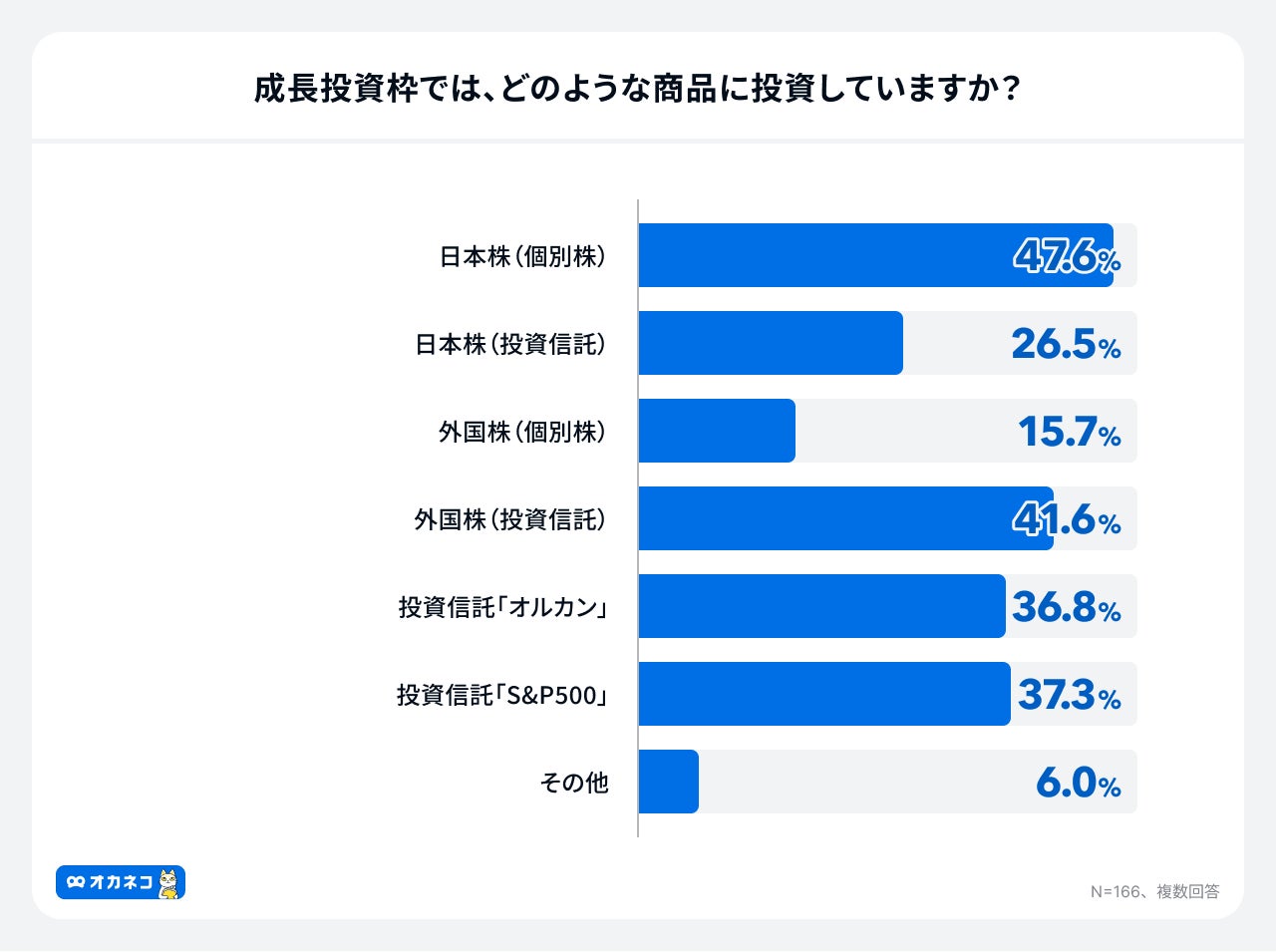 新NISAの成長投資枠を利用している投資家のうち、「日本株(個別株)」に投資している人が47.6%にのぼり、最も多い結果となりました 。次いで「外国株(投資信託)」(41.6%)、「投資信託「S&P500」」(37.3%)、「投資信託「オルカン」」(36.8%)と続き、成長投資枠では投資信託だけでなく、個別株投資への関心も高いことが明らかになりました。
