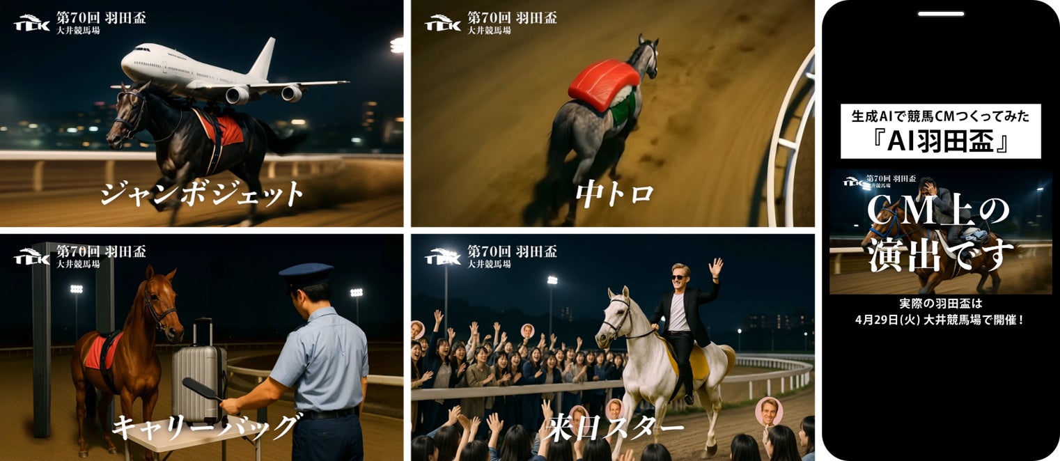 東京シティ競馬(TCK)では、4月29日(火・祝)に行われる3歳ダート三冠初戦の「羽田盃(JpnⅠ)」、ダートの世代最強馬を決定する「東京ダービー(JpnⅠ)」、上半期ダート競馬の総決算「帝王賞(JpnⅠ)」を盛り上げる特別企画として、競馬ファンだけでなく競馬未経験者の皆様にもTCKのビッグレースに興味を持っていただくために、世の中の大きな関心事となっている“生成AI”を活用した新しい競馬CMシリーズをスタート。第1弾として「生成AIで競馬CMつくってみた –羽田盃編-」を公開しましたのでお知らせします。