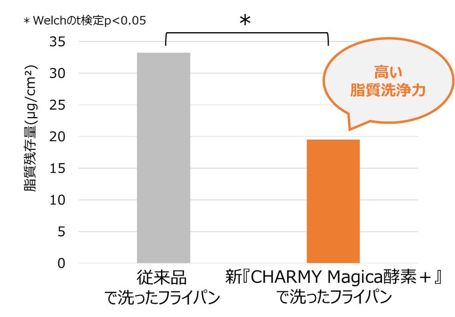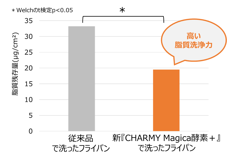 新たに脂質分解酵素を配合した新『CHARMY Magica酵素+(プラス)』は、脂質分解酵素を含まない従来品と比べて、「脂質」洗浄力が上回ることを確認しました(図6)。