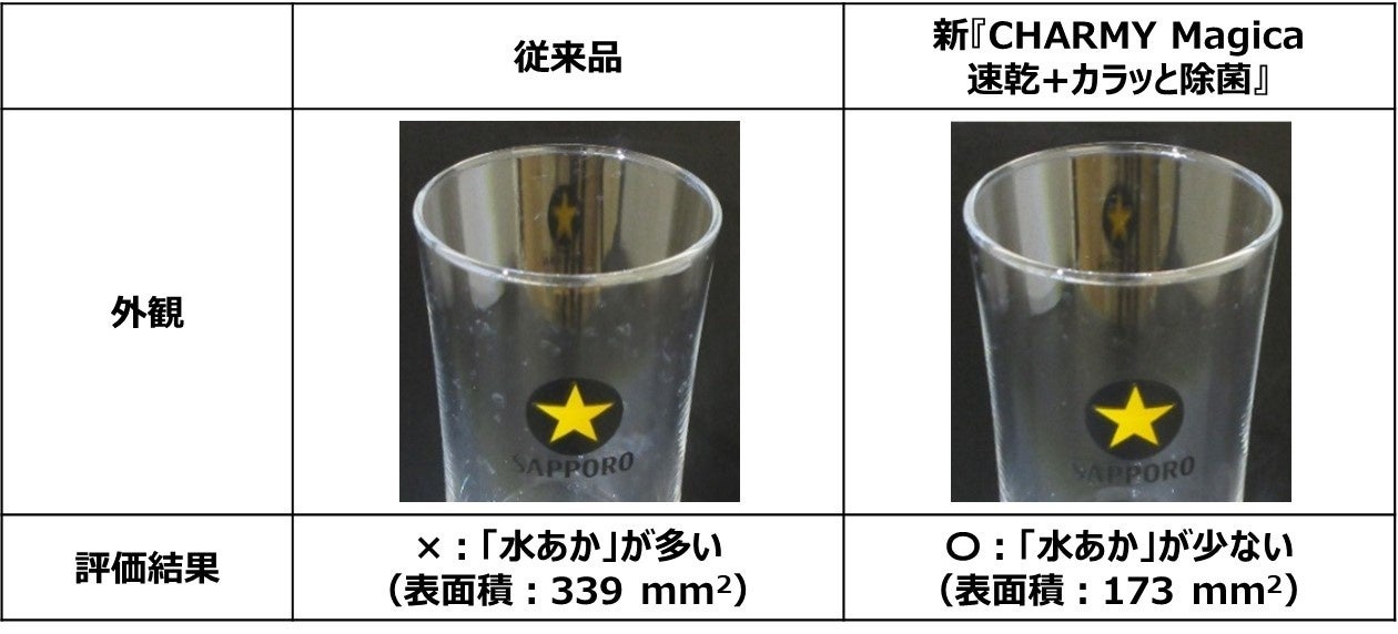 グラスを新『CHARMY Magica速乾+(プラス)カラッと除菌』で洗浄すると、水切れが速く、従来品に比べて「水あか」 が残りにくくなりました。さらに、生ビールを注いだ際に生じる「壁面の発泡」が従来品と比べて大幅に低減する傾向を確認しました(図4)。すなわち、新『CHARMY Magica速乾+(プラス)カラッと除菌』で洗浄したグラスは、「水あか」が少ないので、生ビールの外観品質を良好に保つことがわかりました。