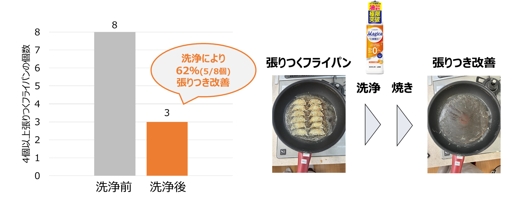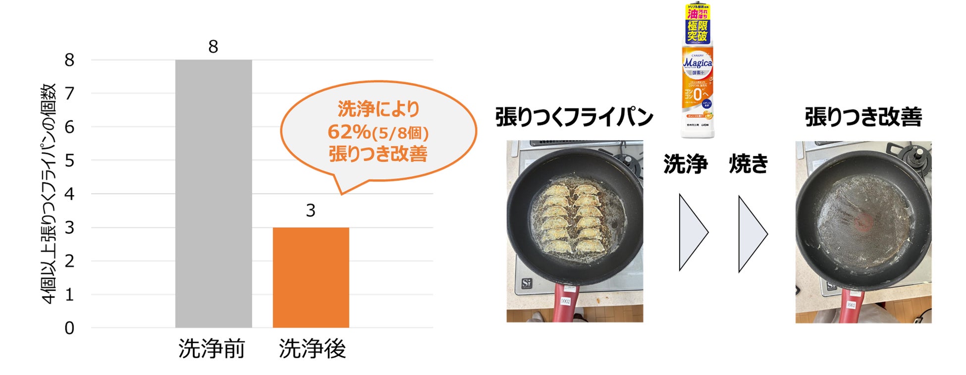 また、新『CHARMY Magica酵素+(プラス)』で洗ったフライパンでは、ギョーザの張りつき度合いが改善されて、キレイにギョーザが焼けました(図7)。