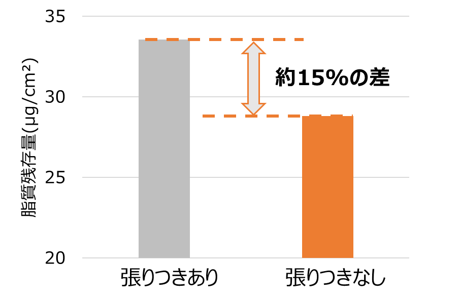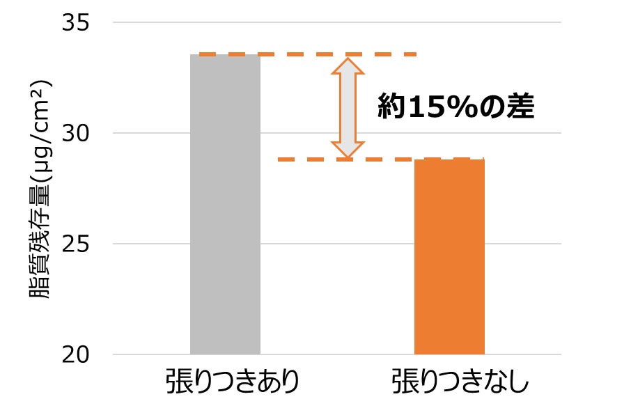 フライパンに残存する汚れは、食材由来の「でんぷん・脂質・たんぱく質」による複合汚れであると考えられます。今回の検証の結果、張りつきやすいフライパンには、より多くの「脂質(※)」が残存していることが示唆されました(図5)。