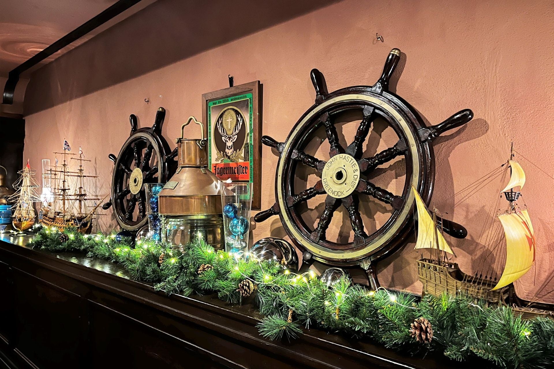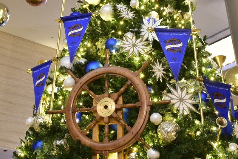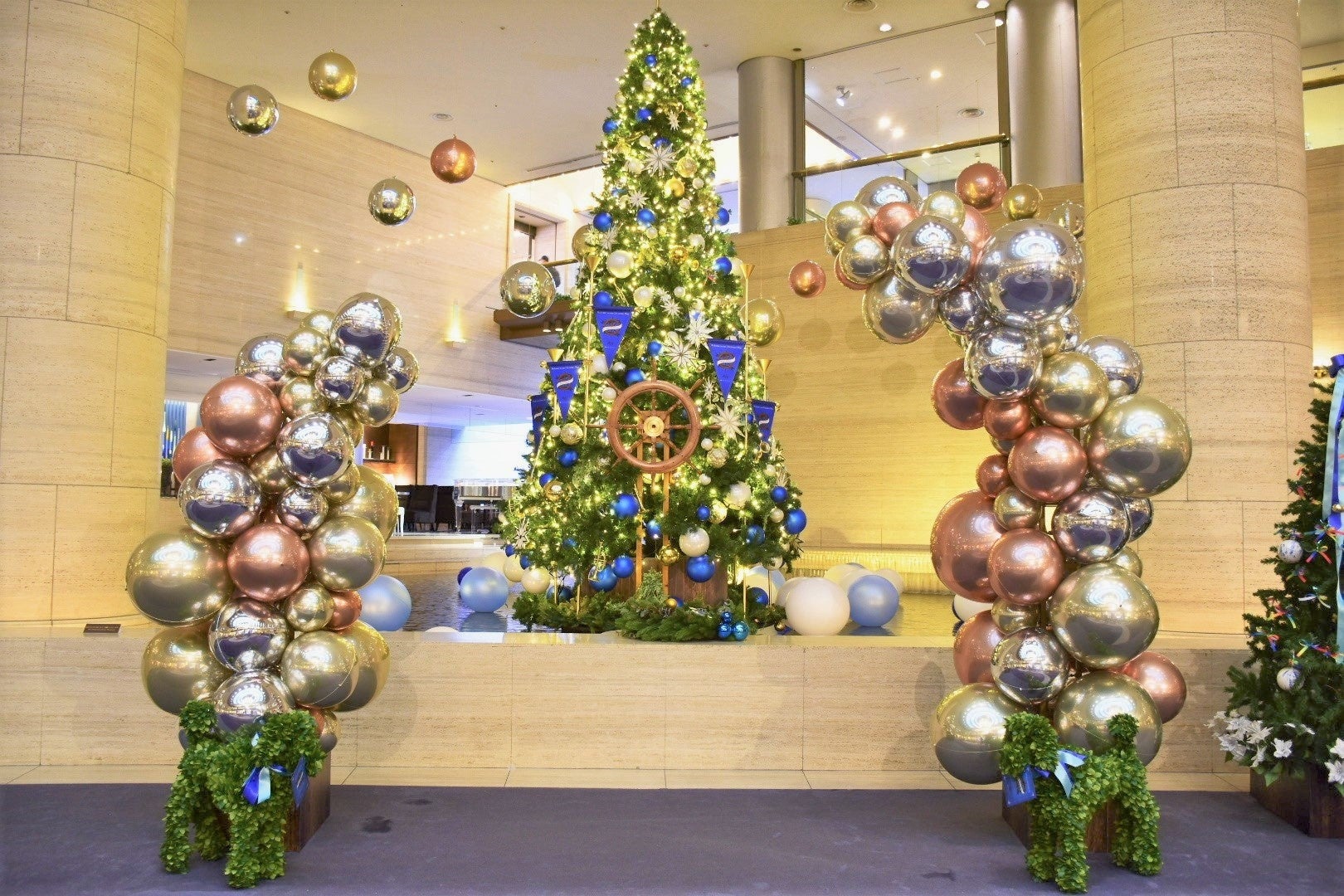 ホテル全体を豪華客船に見立て、天井高17mを誇るメインロビーの水辺エリアに高さ約5mのクリスマスツリーを設置。360度、どこから見ても異なる見え方を楽しんでいただけるよう天井からバルーンを吊るし、これから豪華客船の船出を待つ高揚感を感じさせる空間を演出します。ツリーにはオーシャンブルーを基調にシルバーやゴールドのオーナメントを飾り、洗練された中にも温かみのあるデザインに。また、出航のファンファーレを鳴らすトランペットや旅先へと向かって操縦する舵など、豪華客船をイメージしたオーナメントも。
