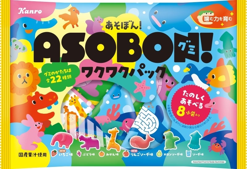 「あそぼん!グミ ワクワクパック」は、お出かけや小分けにしてお子様にグミを与えたいときにぴったりのバラエティテトラパック。グミの形はシークレット型を含め全22種類で、テトラ包装の親子で遊びたくなる仕掛けもリニューアルしました。