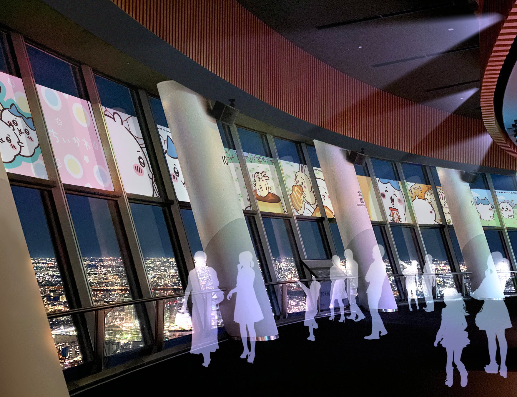 地上450メートルの天望回廊では、イベント限定のコラボイラストのキャラクターたちと撮影ができるフォトスポットや、みんなの願いごとを書き込んだ絵馬をかけることができる参加型展示スポットを設置します。