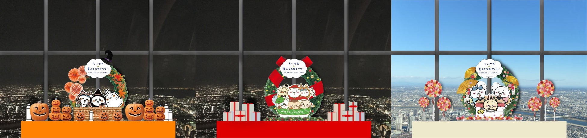 地上450メートルの天望回廊を中心に、ちいかわを始めとしたキャラクターたちがお出迎え。イベント限定のコラボイラストを使用したフォトスポットや、願いごとを書いた絵馬をかけることができる参加型展示スポットなどを設置します。