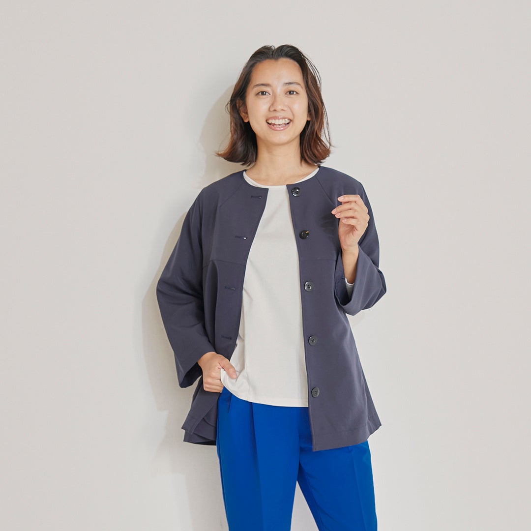 パンツ同様、素材の一部に再生ポリエステルを使用したノーカラージャケット。高密度でストレッチ性に優れた素材は、型崩れしにくく動きやすいのが特徴です。