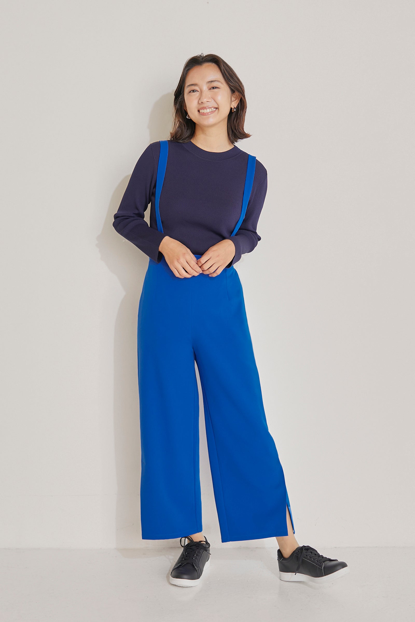 サスペンダーで2WAYの着こなしができるワイドパンツにも、素材の一部に再生ポリエステルを使用しています。裾のスリットが抜け感と軽やかさを演出します。