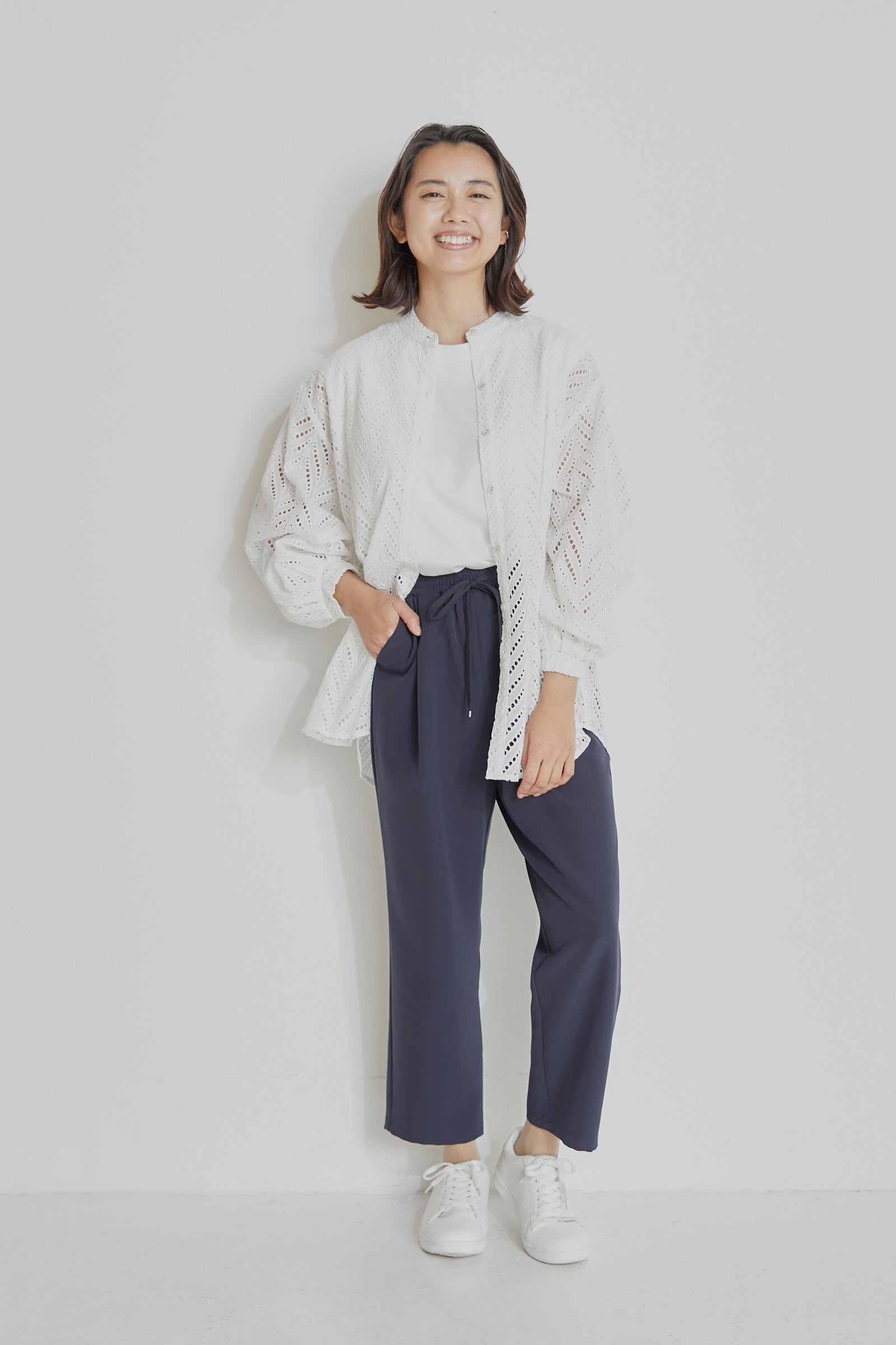 ウエストひもが付いたイージー仕様のテーパードパンツが初登場。リラックス感がありながら、程よいテーパードですっきりと見せてくれます。素材の一部に再生ポリエステルを使用しています。