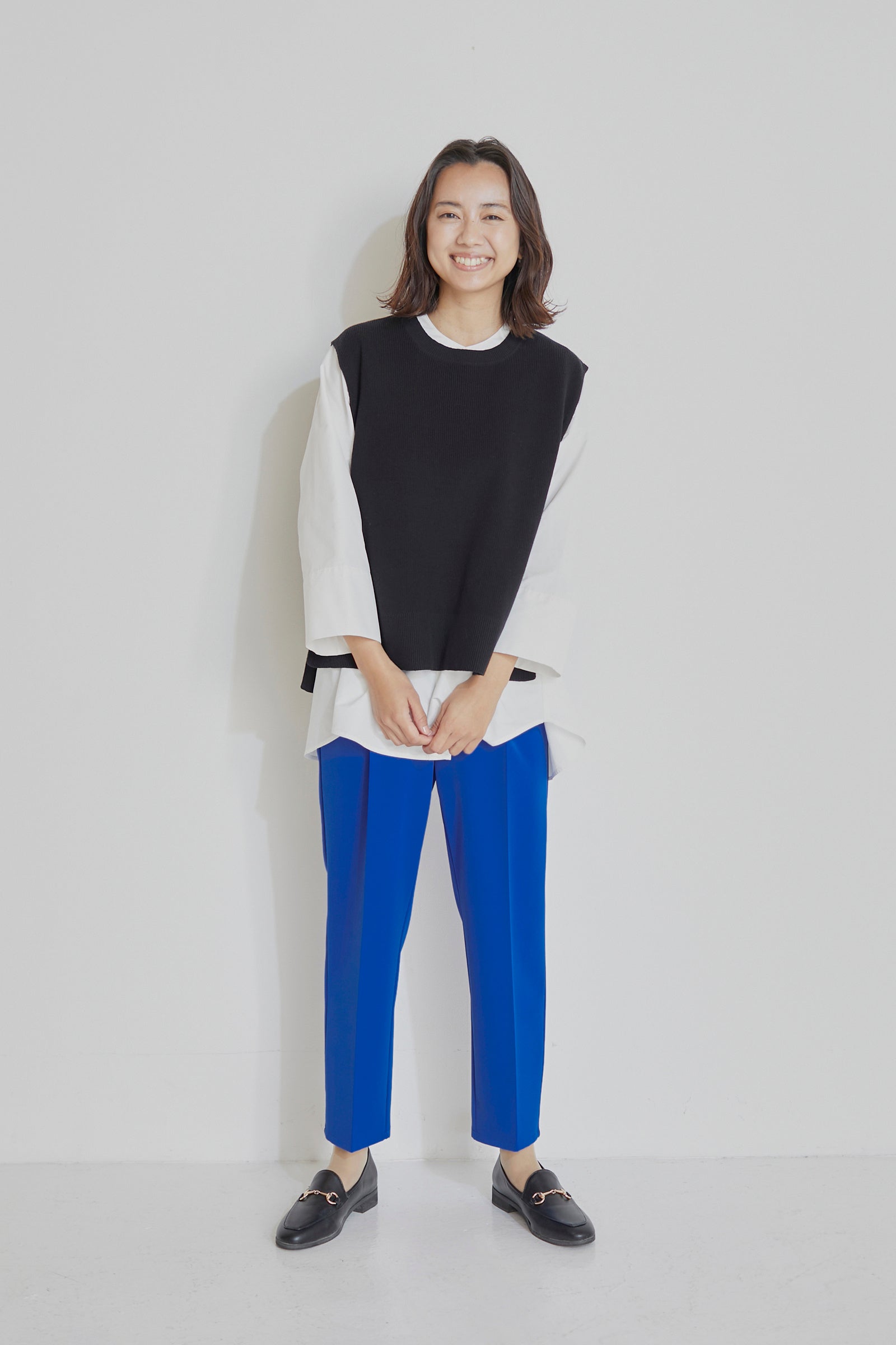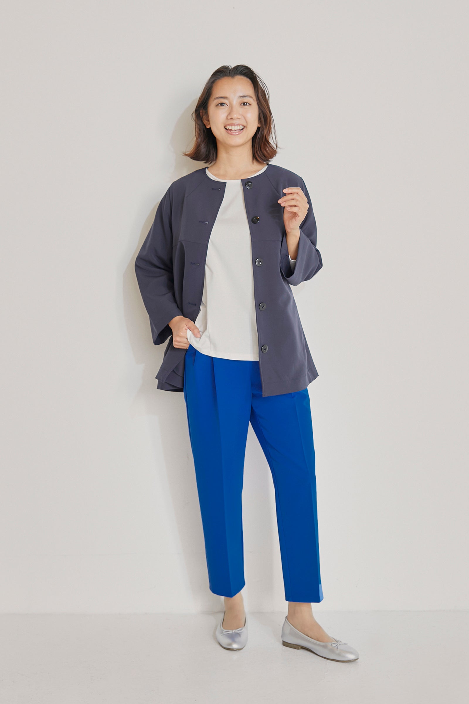 ストレッチ性や防汚撥水機能はそのままに、素材の一部に環境に優しい再生ポリエステルを使用し、シルエットも見直しました。はくだけでスタイルアップをかなえるテーパードパンツです。