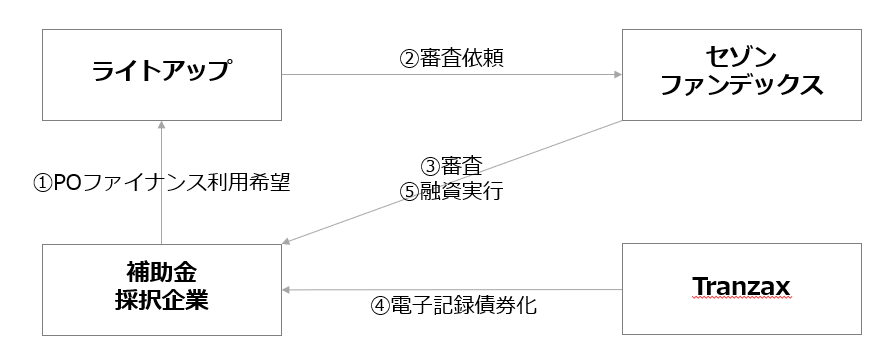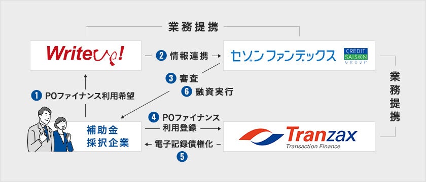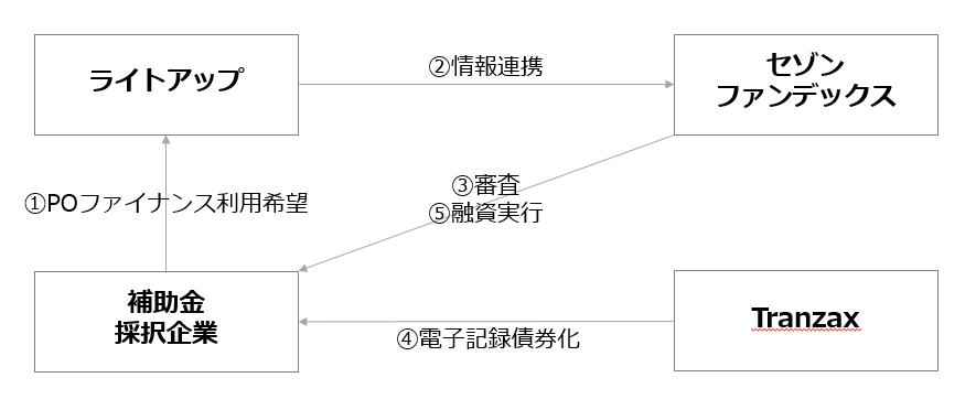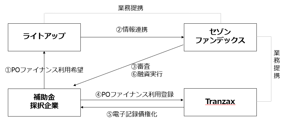 株式会社ライトアップ(本社:東京都渋⾕区、代表取締役社⻑:⽩⽯崇、以下ライトアップ)は、株式会社セゾンファンデックス(本社:東京都豊島区、代表取締役社⻑:⻘⼭照久、以下セゾンファンデックス)と提携し、Tranzax株式会社(本社:東京都港区、代表取締役社長:大塚博之 以下Tranzax)がサービスを提供する「補助金対応POファイナンス」の推進に合意致しました。なお、推進にあたりライトアップが「中間審査機能」を持つことで、セゾンファンデックス・中⼩企業双⽅のPOファイナンス®利⽤のハードルを軽減することを予定しています。