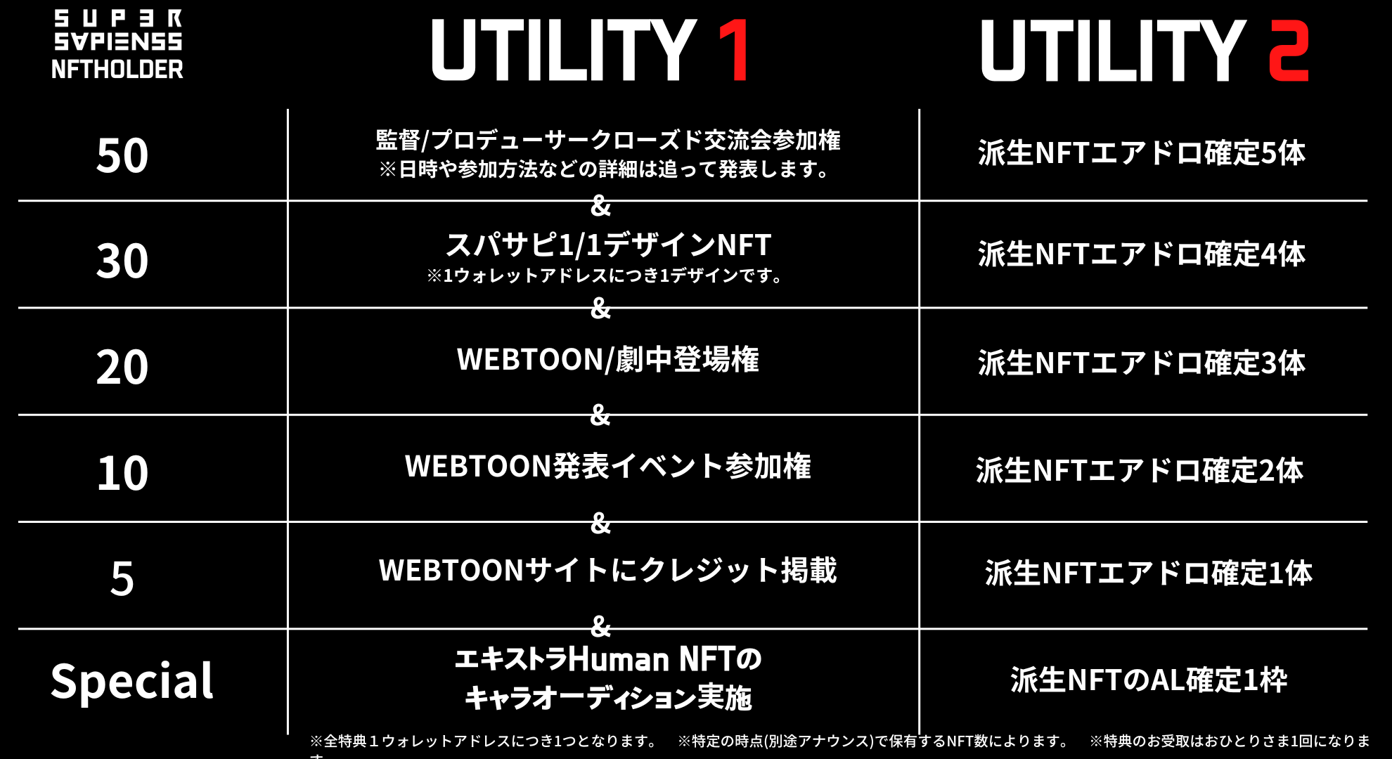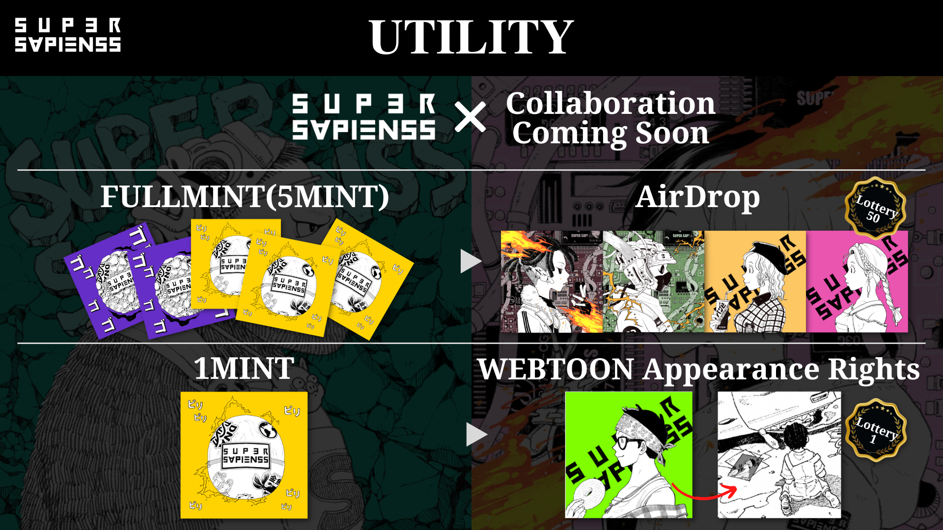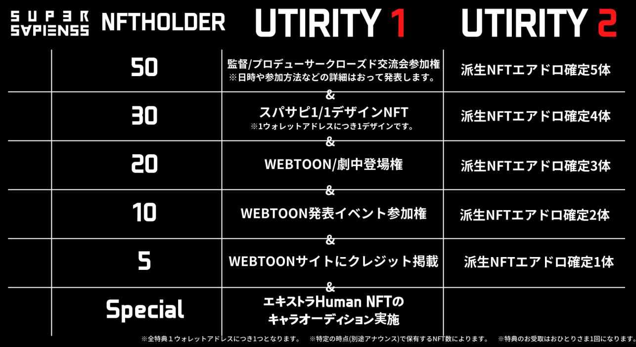 販売を記念して、SUPER SAPIENSS NFTを購入された方へユーティリティ(保有特典)を準備しています。1MINTされた方には抽選で1名様に保有NFTのWEBTOON登場権、5MINTされた方には抽選で50名様にSUPER SAPIENSS NFTがエアドロップします。