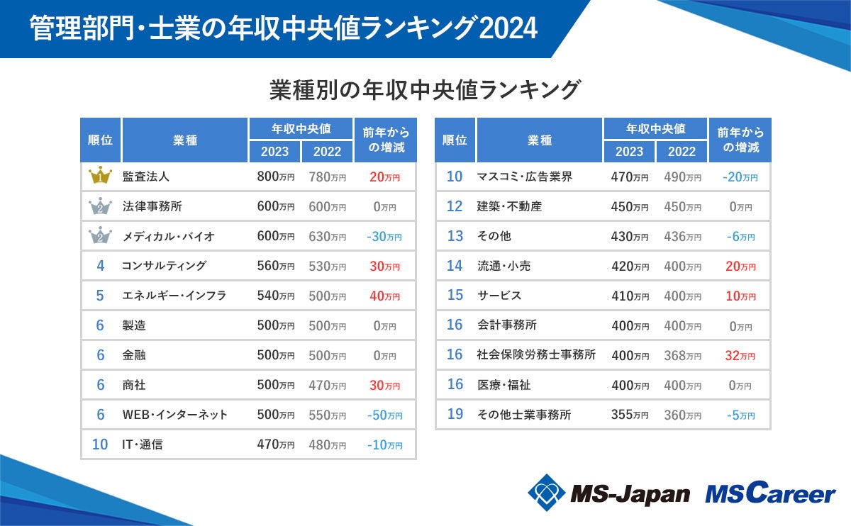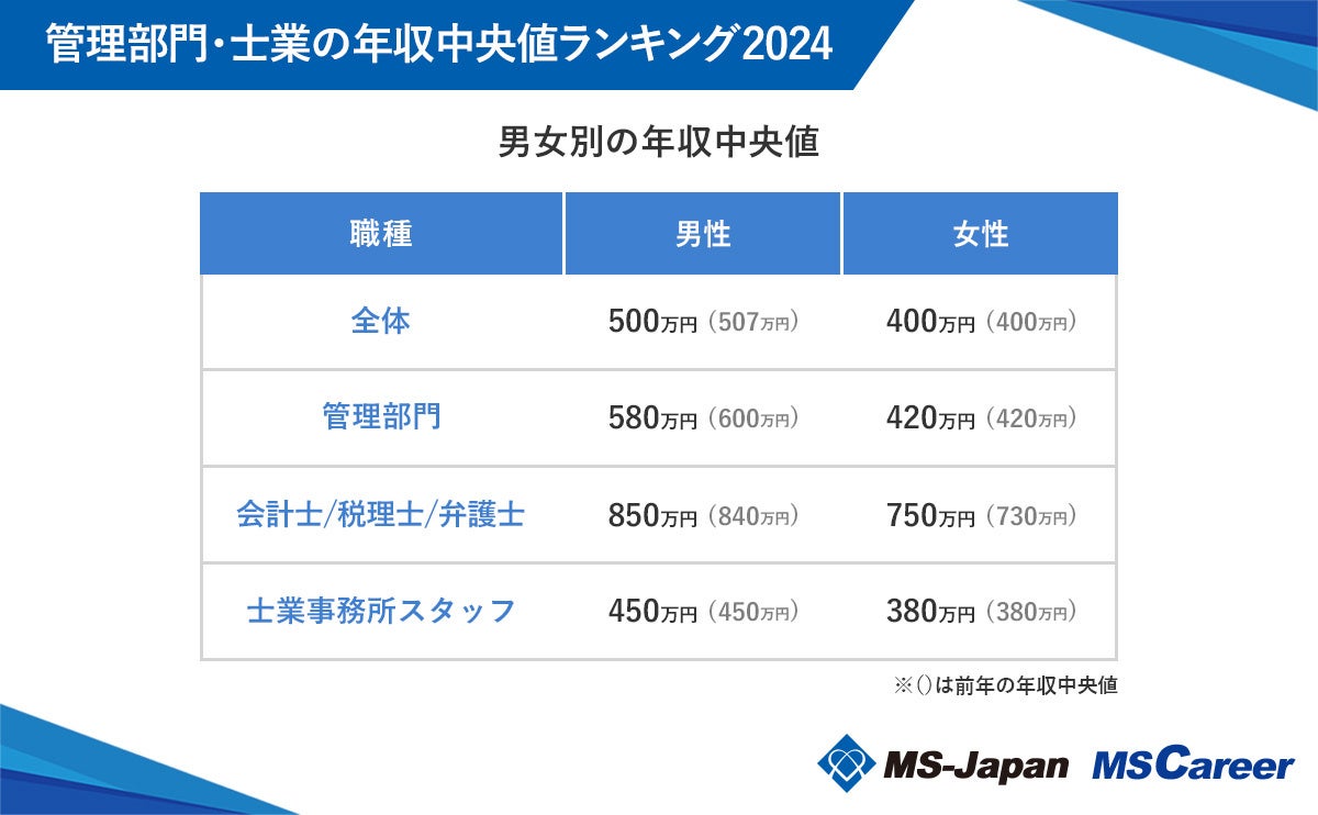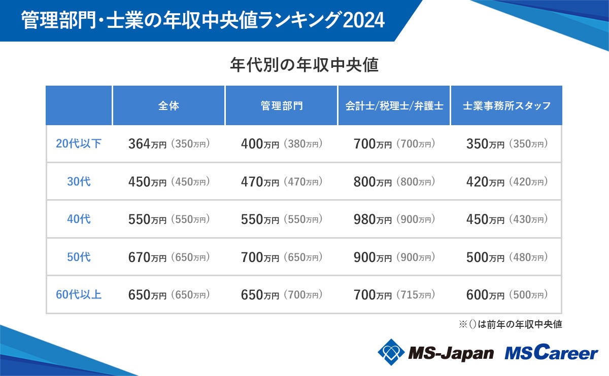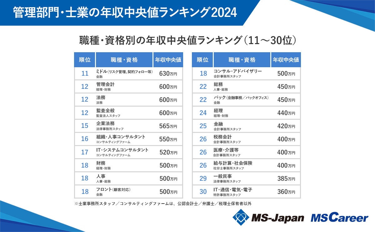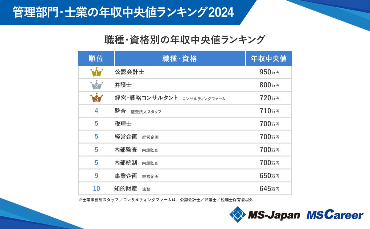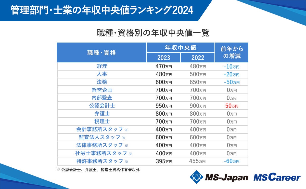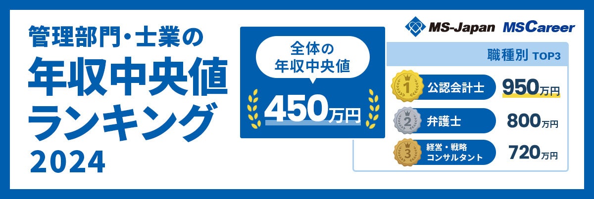MS-Japanが【年収中央値ランキング2024】を発表。1位は公認会計士(950万)で、全体中央値は450万!