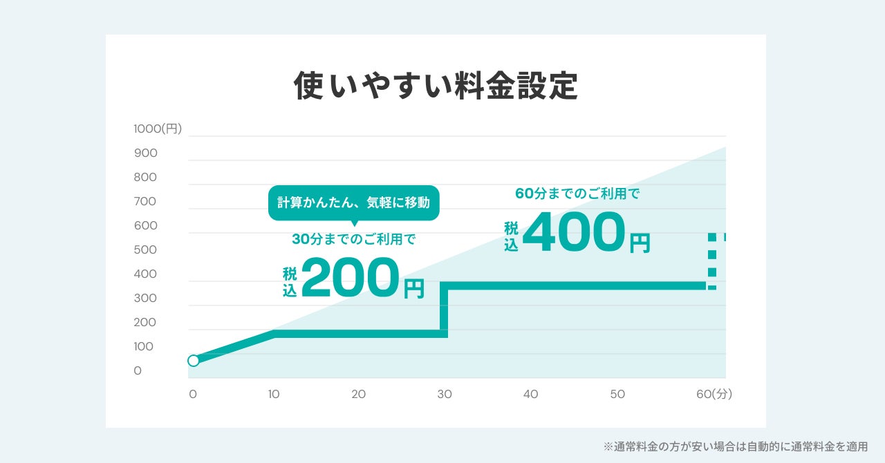 2024年3月1日(金)に、東京、京都、横浜、神戸、名古屋、広島のご利用料金を、「ライド基本料金50円+1分ごとに15円」に変更します(大阪は「ライド基本料金50円+1分ごとに15円」の料金体系を継続していたため、変更はございません)。
