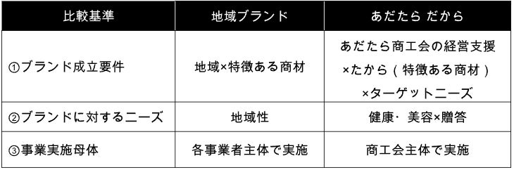 ① あだたら商工会支援商品を商工会が独自にプロデュースする今までにない商工会ブランドです。一般的地域ブランドとの違い、経営支援によって地域性だけではないブランドコンセプトに基づいた消費者にとって価値ある商品を提供していきます。