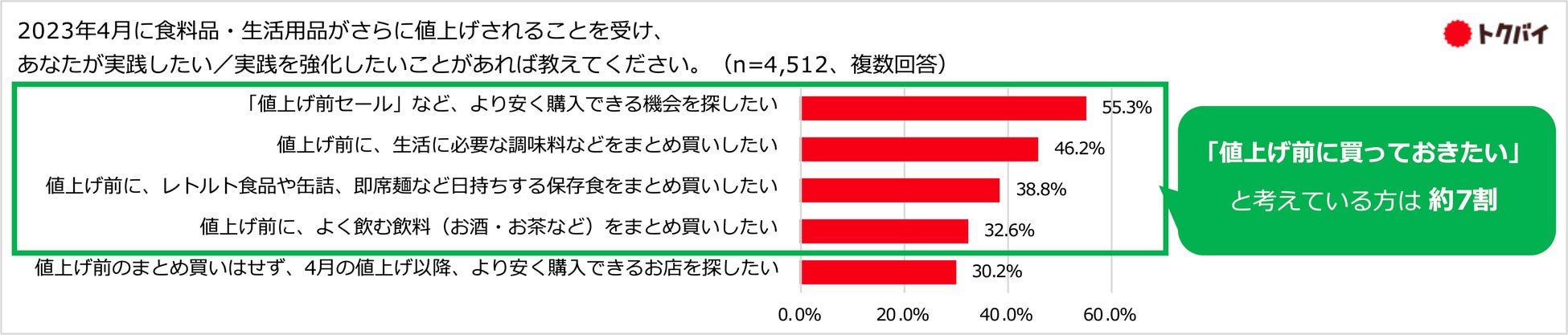 2023年4月に食料品・日用品のさらなる値上げが控える中、実践したい/実践を強化したいことについてたずねたところ、「 “値上げ前セール” で安く購入したい」 「生活に必要な調味料や日持ちする保存食、よく飲む飲料などを値上げ前にまとめ買いしたい」など、「値上げ前に買っておきたい」と考えている方が回答者全体の約7割にのぼりました。