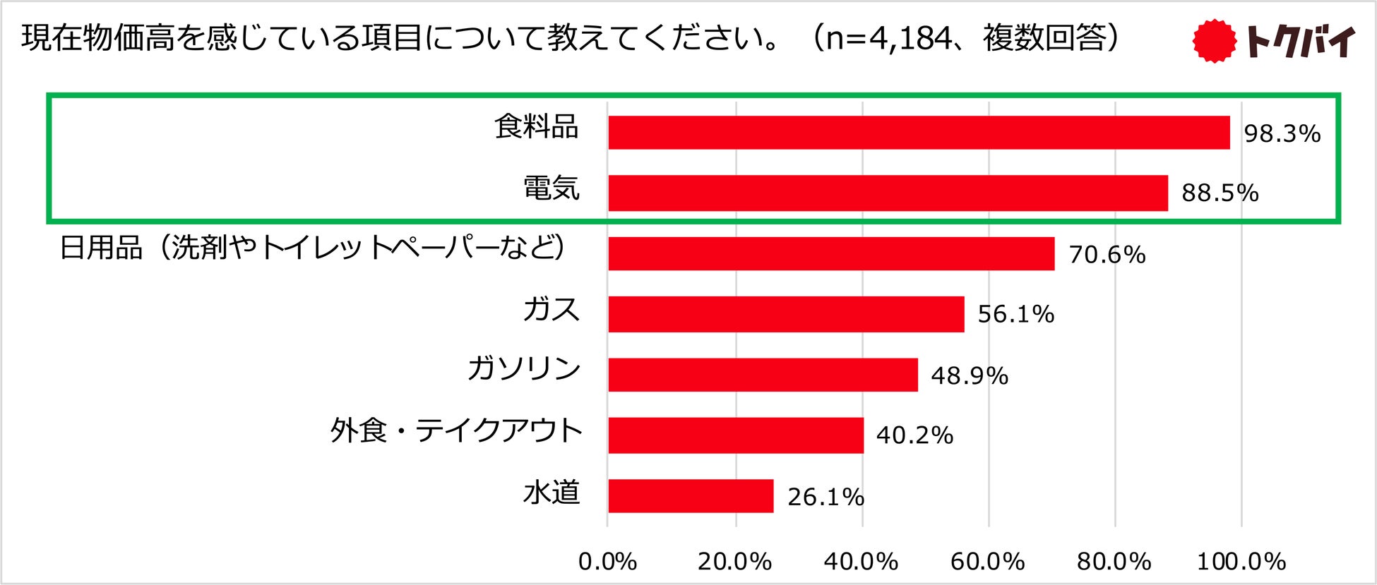 現在物価高を感じている項目についてたずねたところ、「食料品」が98.3%で最多となり、次いで「電気」が88.5%となりました。