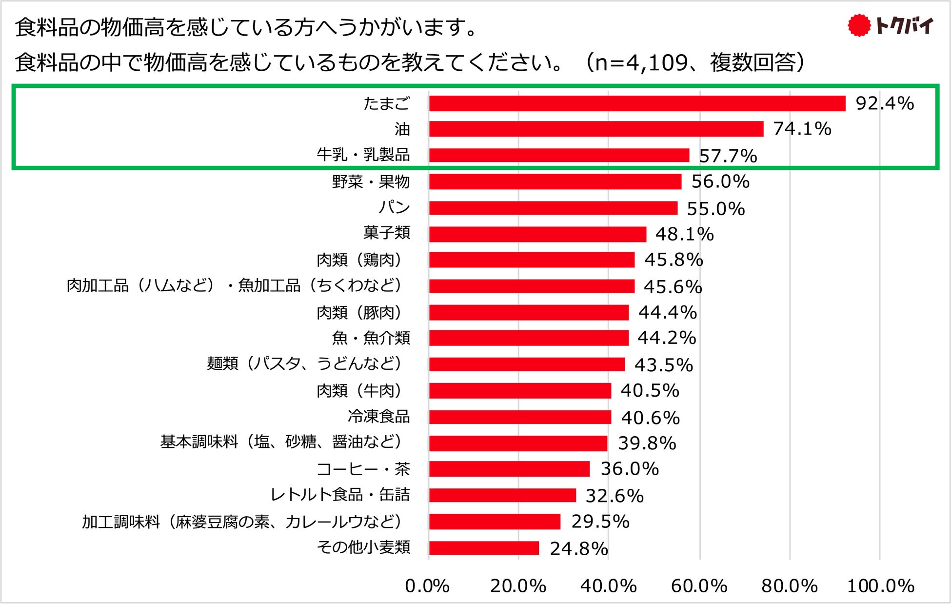 「食料品」の物価高を感じている方へ、具体的にどのようなものに物価高を感じているかをたずねたところ、「たまご」との回答が92.4%で最多となり、次いで「油」が74.1%、「牛乳・乳製品」が57.7%となりました。