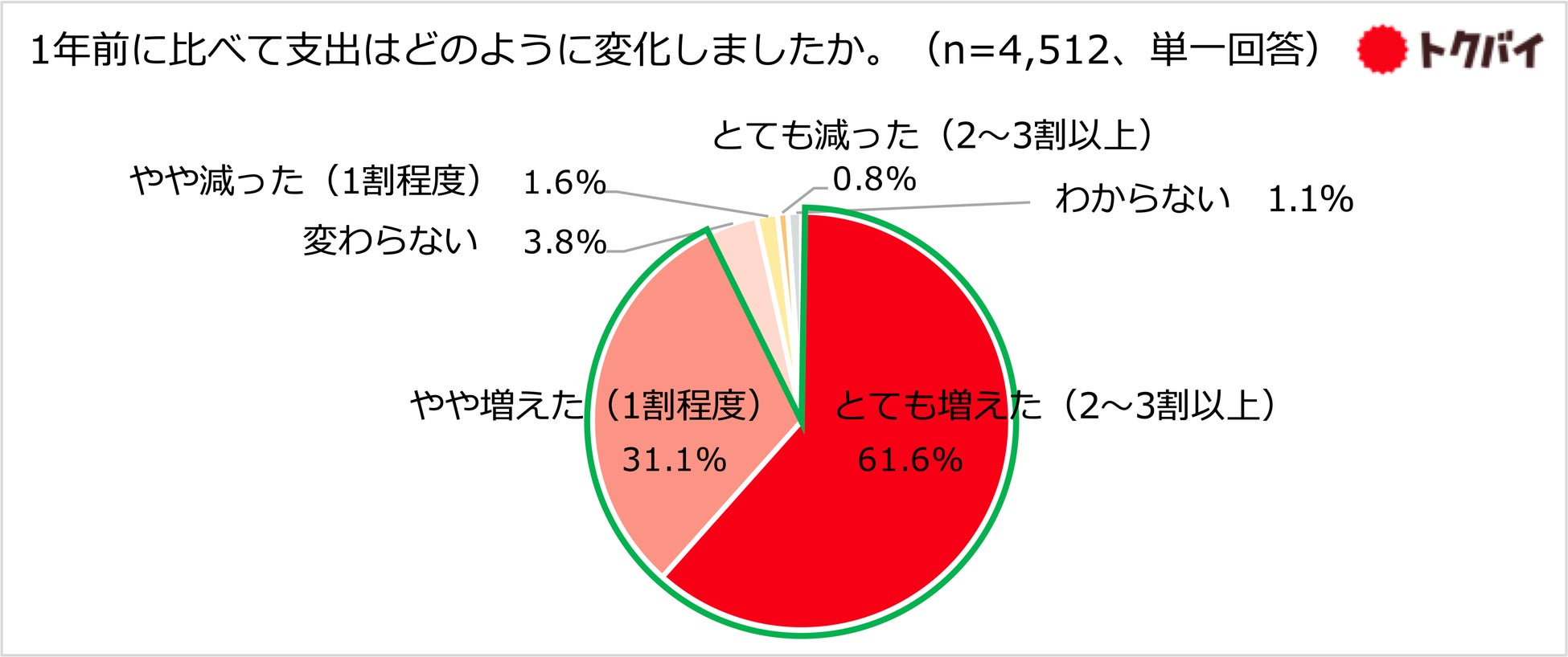 1年前に比べて支出がどのように変化したかをたずねたところ、「とても増えた(2〜3割以上)」との回答が61.6%、「やや増えた(1割程度)」が31.1%で、合わせて9割超となりました。