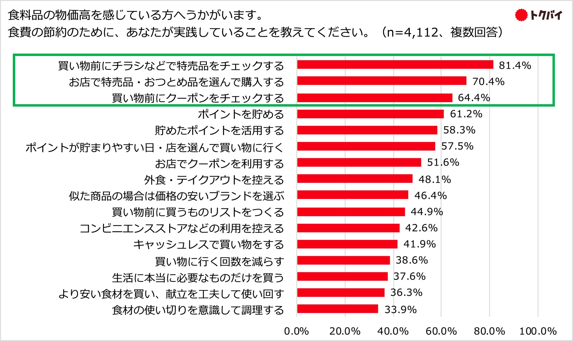 - 食費節約のために実践していることTOP3は「買い物前にチラシをチェック」「おつとめ品や特売品を購入」「買い物前にクーポンをチェック」