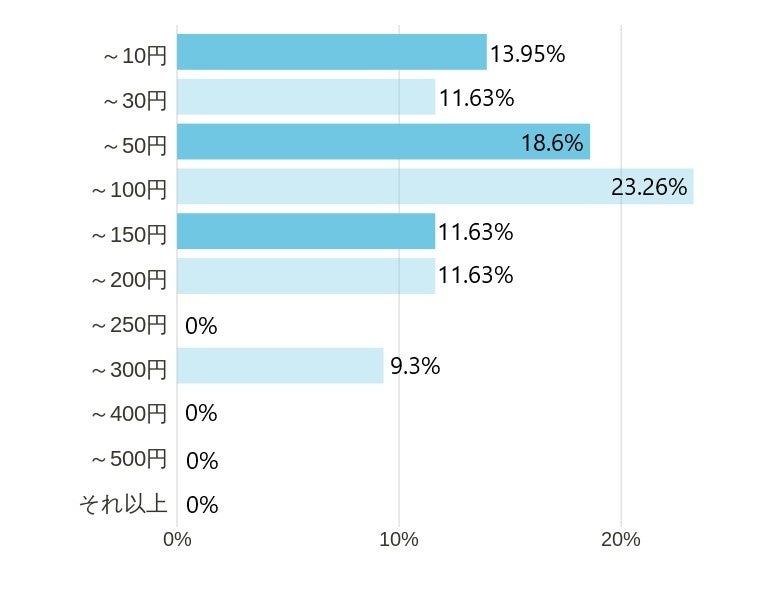 普段使いの価格帯としては、~50円が18.6%、~100円が23.26%となっており、薬局・スーパー等で見られる一番お手頃な価格帯(40円前後)のものよりも、少し高めのものを使用する傾向にあるようです。ただ、高くても~300円止まりで、それ以上のものを普段使いとしているかたは0%でした。