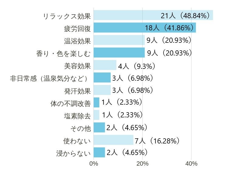入れる理由について伺ってみたところ、トップにリラックス効果・疲労回復とあり、特に“リラックス効果”については約半数のかたが理由に挙げています。