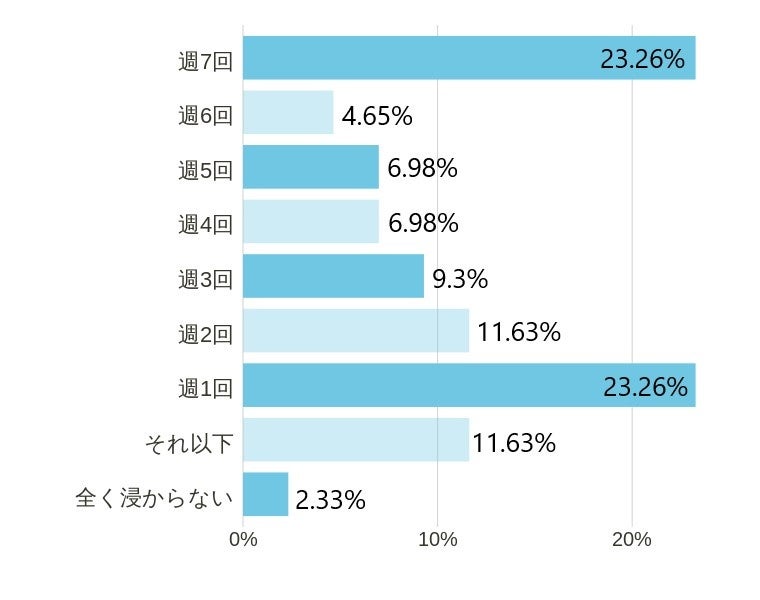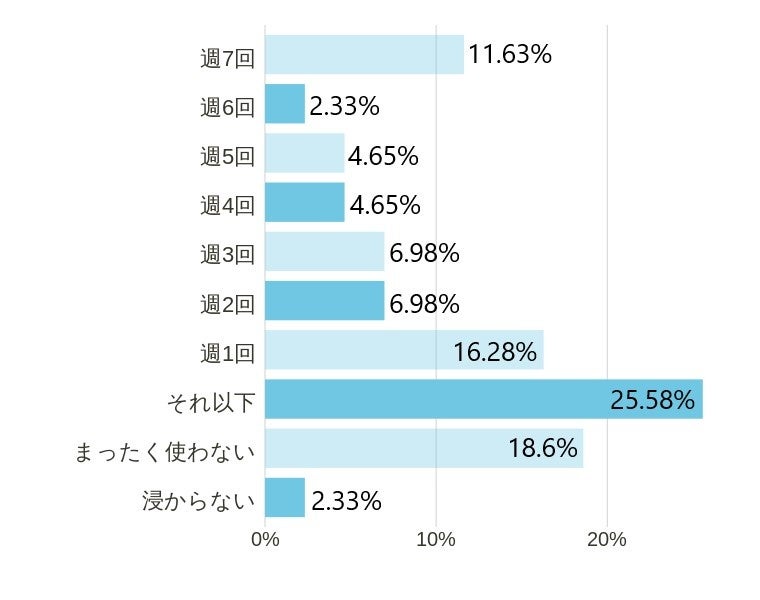 ただし、週1以上入浴するかたで見ると85%以上もの数値に。毎日ではないものの、最低週1以上は入るというかたが非常に多くいることがわかります。