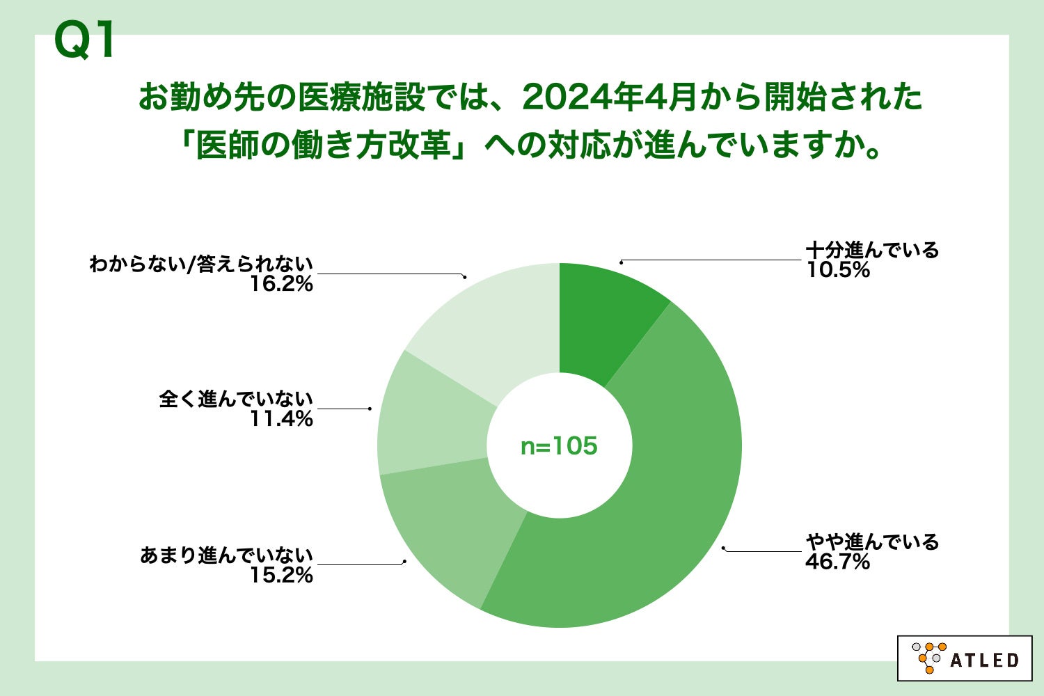 「Q1.お勤め先の医療施設では、2024年4月から開始された「医師の働き方改革」への対応が進んでいますか。」(n=105)と質問したところ、「十分進んでいる」が10.5%、「やや進んでいる」が46.7%という回答となりました。