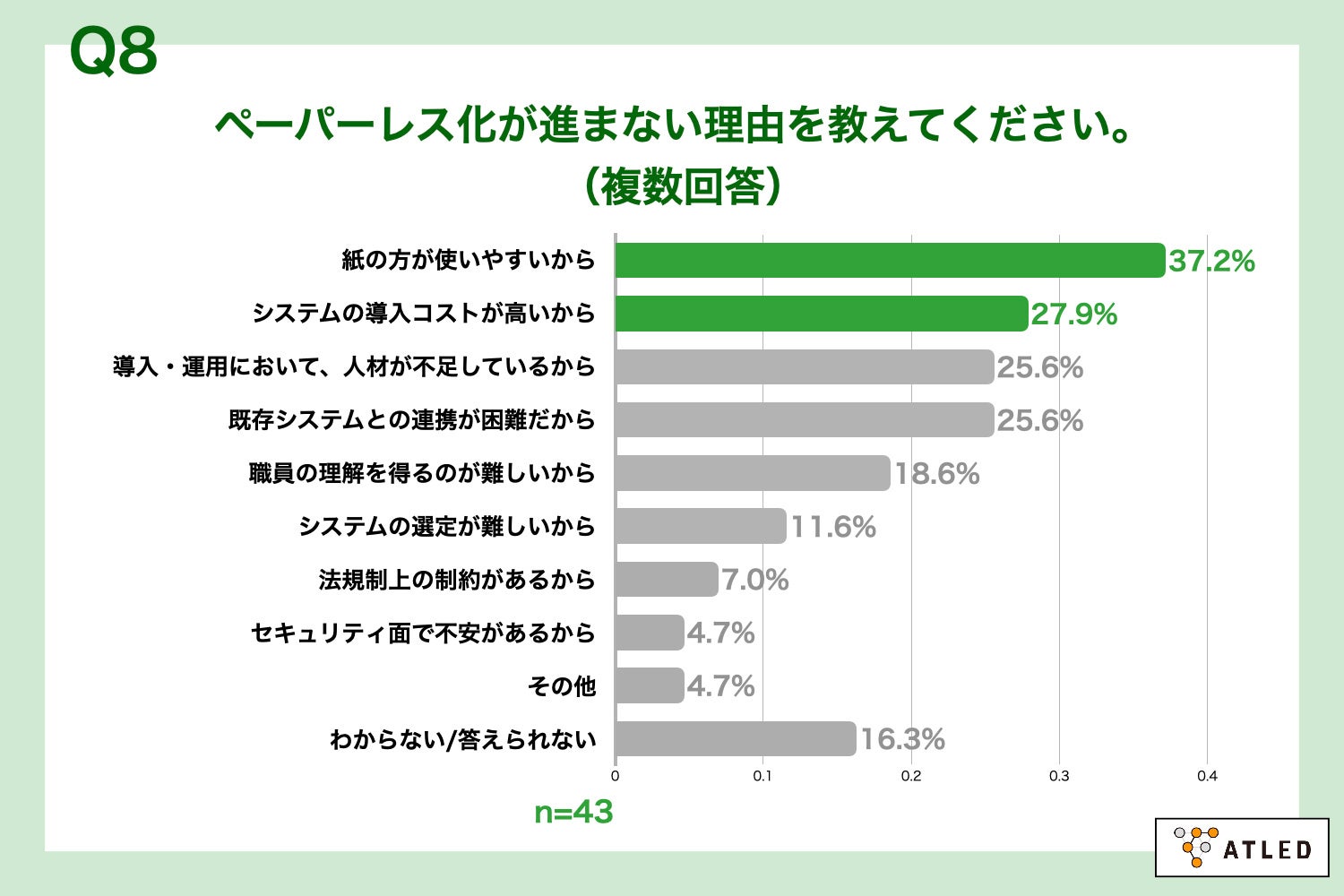 Q7で「あまり進んでいない」「ほとんど進んでいない」と回答した方に、「Q8.ペーパーレス化が進まない理由を教えてください。(複数回答)」(n=43)と質問したところ、「紙の方が使いやすいから」が37.2%、「システムの導入コストが高いから」が27.9%という回答となりました。