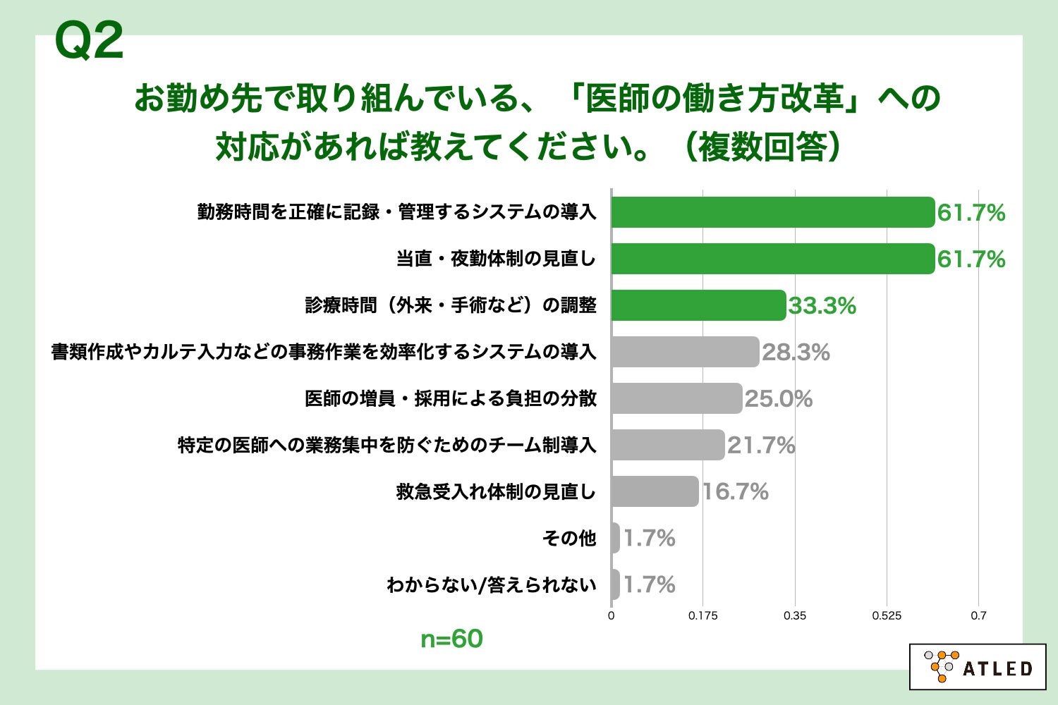 Q1で「十分進んでいる」「やや進んでいる」と回答した方に、「Q2.お勤め先で取り組んでいる、「医師の働き方改革」への対応があれば教えてください。(複数回答)」(n=60)と質問したところ、「勤務時間を正確に記録・管理するシステムの導入」が61.7%、「当直・夜勤体制の見直し」が61.7%、「診療時間(外来・手術など)の調整」が33.3%という回答となりました。