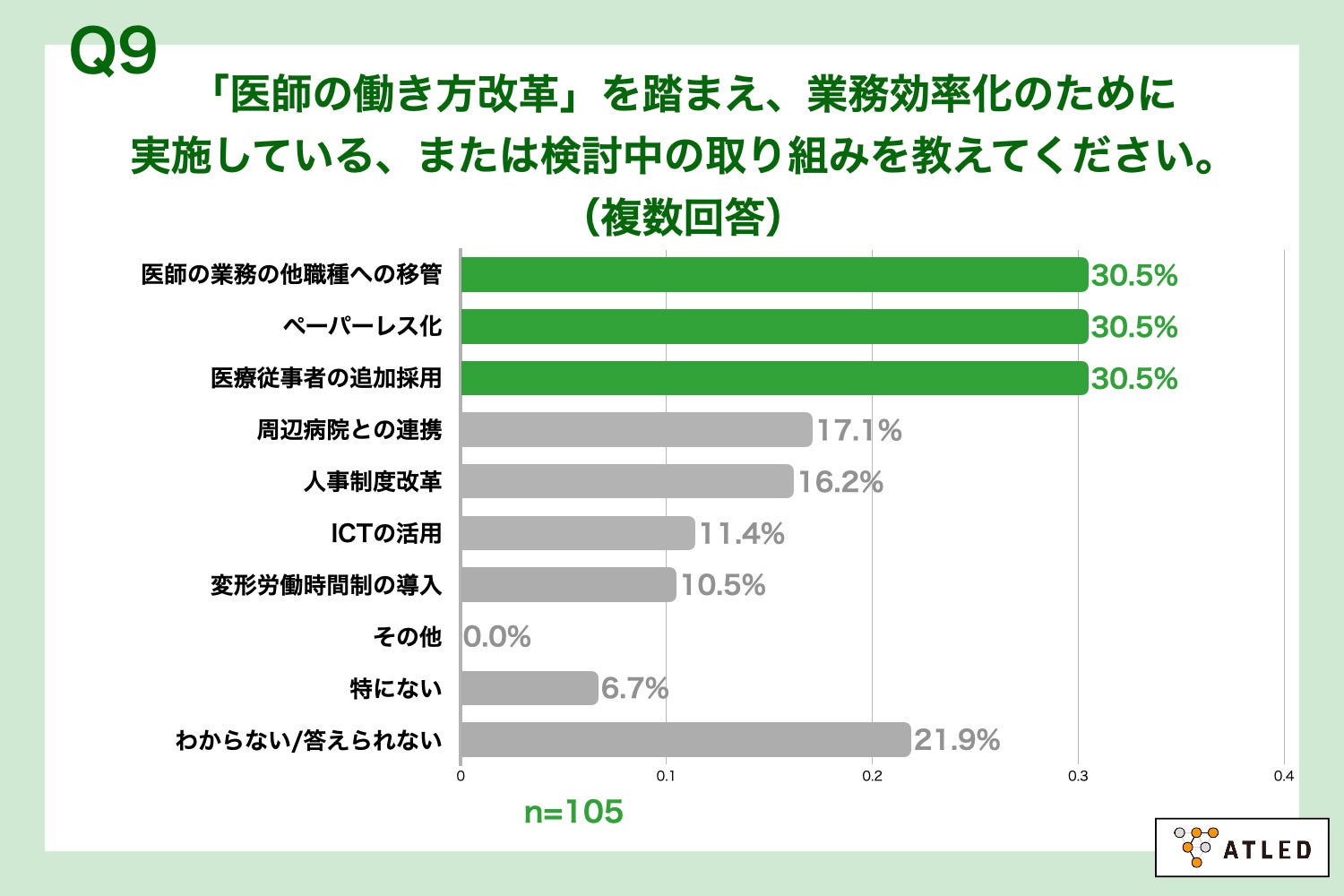 「Q9.「医師の働き方改革」を踏まえ、業務効率化のために実施している、または検討中の取り組みを教えてください。(複数回答)」(n=105)と質問したところ、「医師の業務の他職種への移管」が30.5%、「ペーパーレス化」が30.5%、「医療従事者の追加採用」が30.5%という回答となりました。