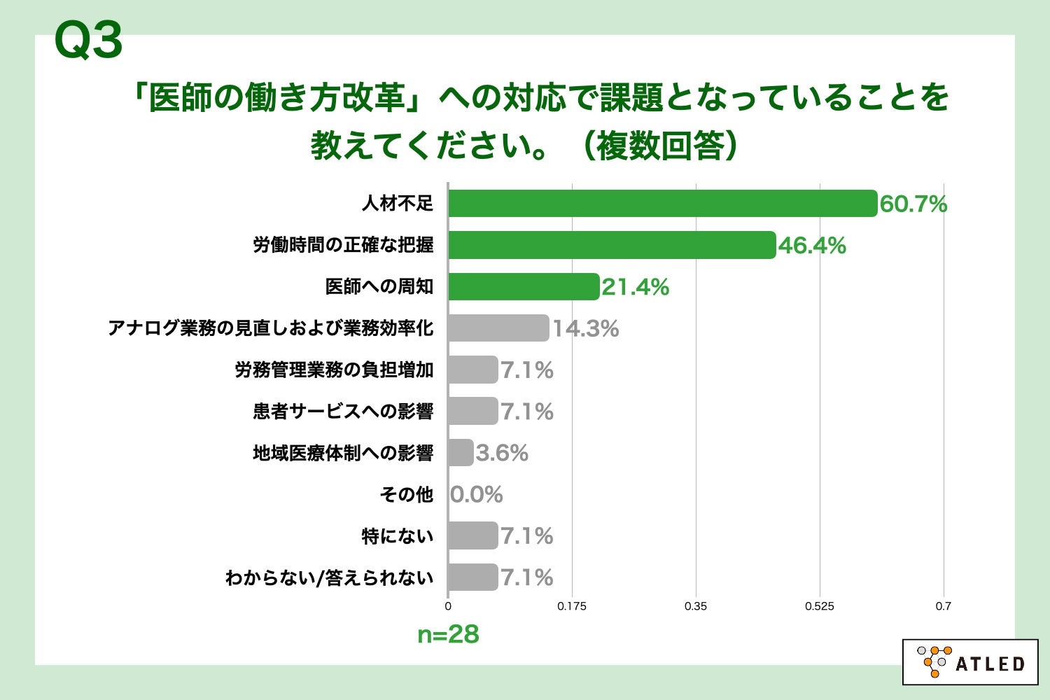Q1で「あまり進んでいない」「全く進んでいない」と回答した方に、「Q3.「医師の働き方改革」への対応で課題となっていることを教えてください。(複数回答)」(n=28)と質問したところ、「人材不足」が60.7%、「労働時間の正確な把握」が46.4%、「医師への周知」が21.4%という回答となりました。